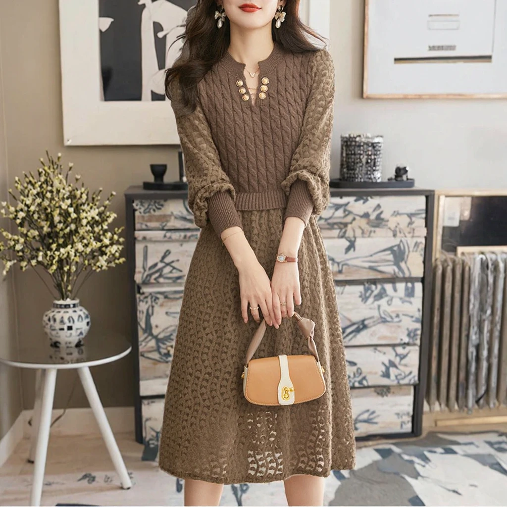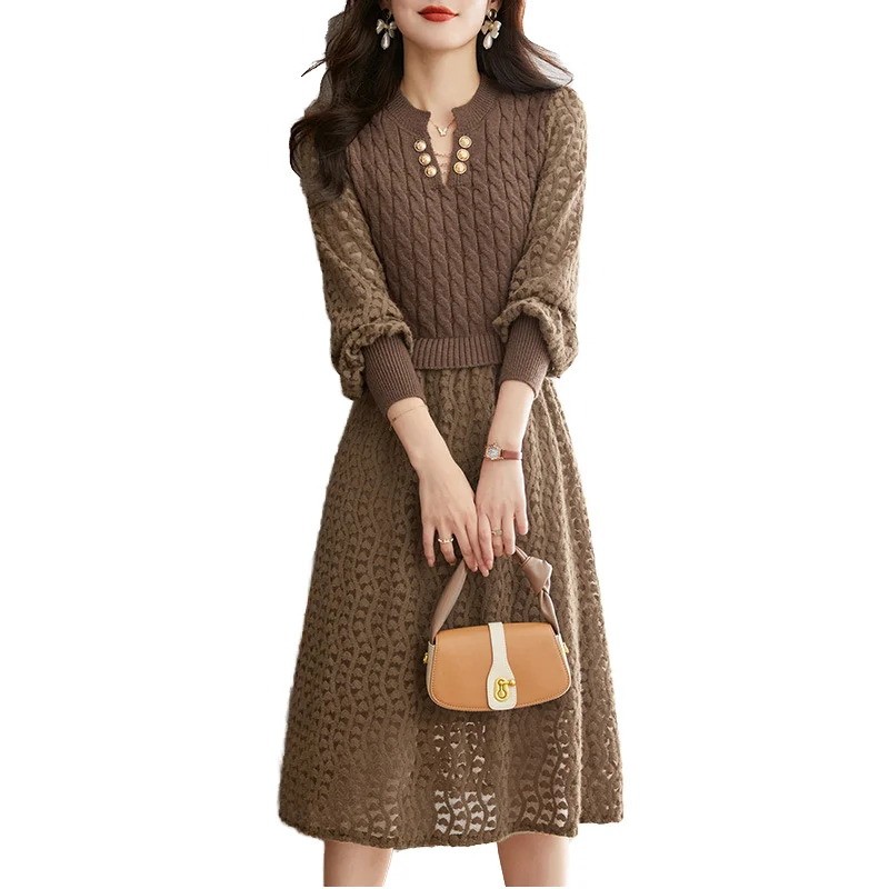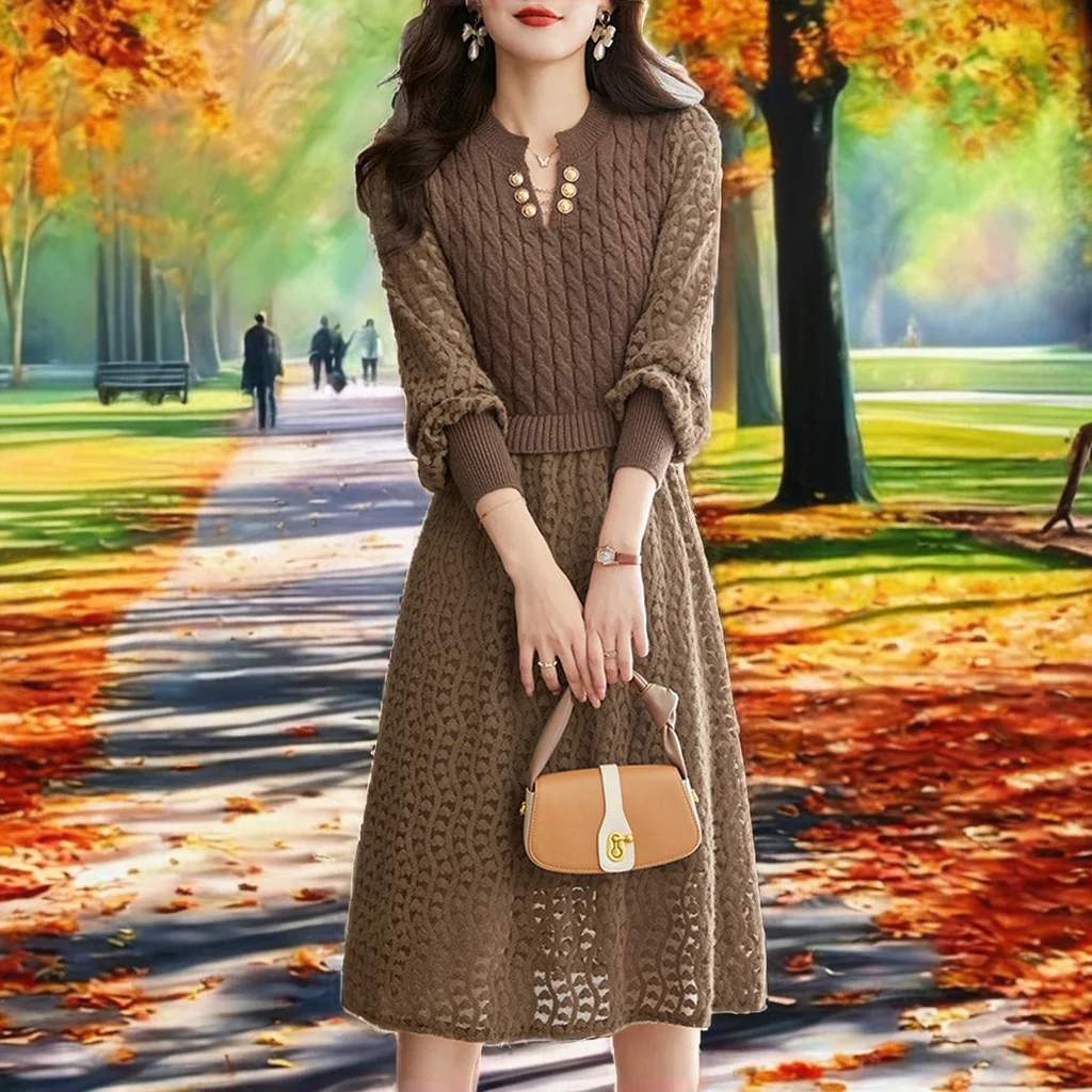 Customize Ladies A-Line Floor-Length Woolen Knitted Autumn Natural Waist Solid Long Dress Sweater