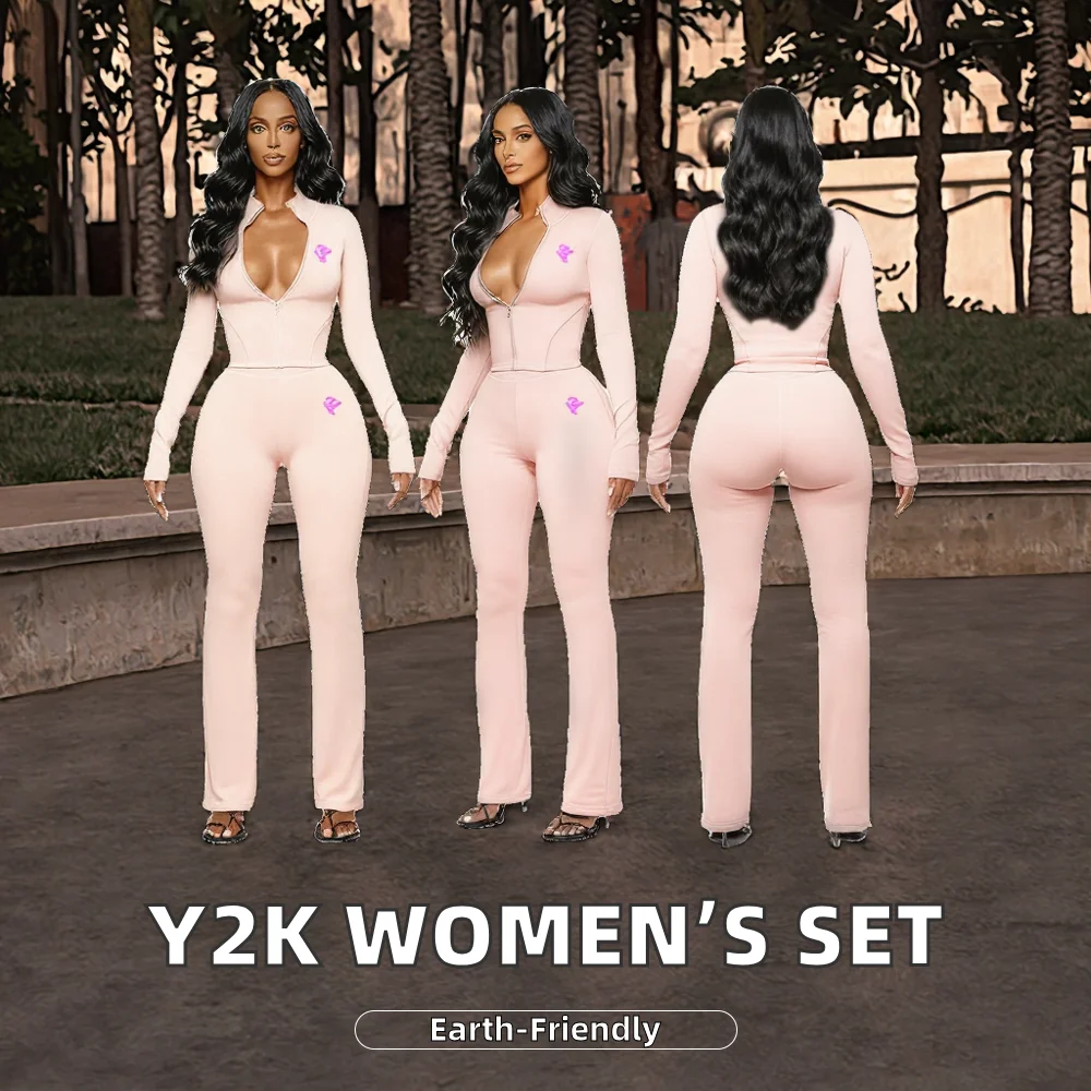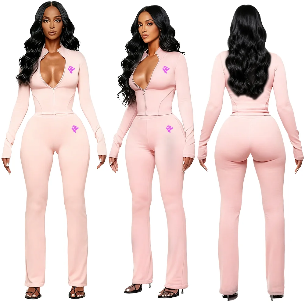 Customize Women's Autumn Solid Two Piece Long Fleece Y2K Streetwear Loungewear Tracksuit Set