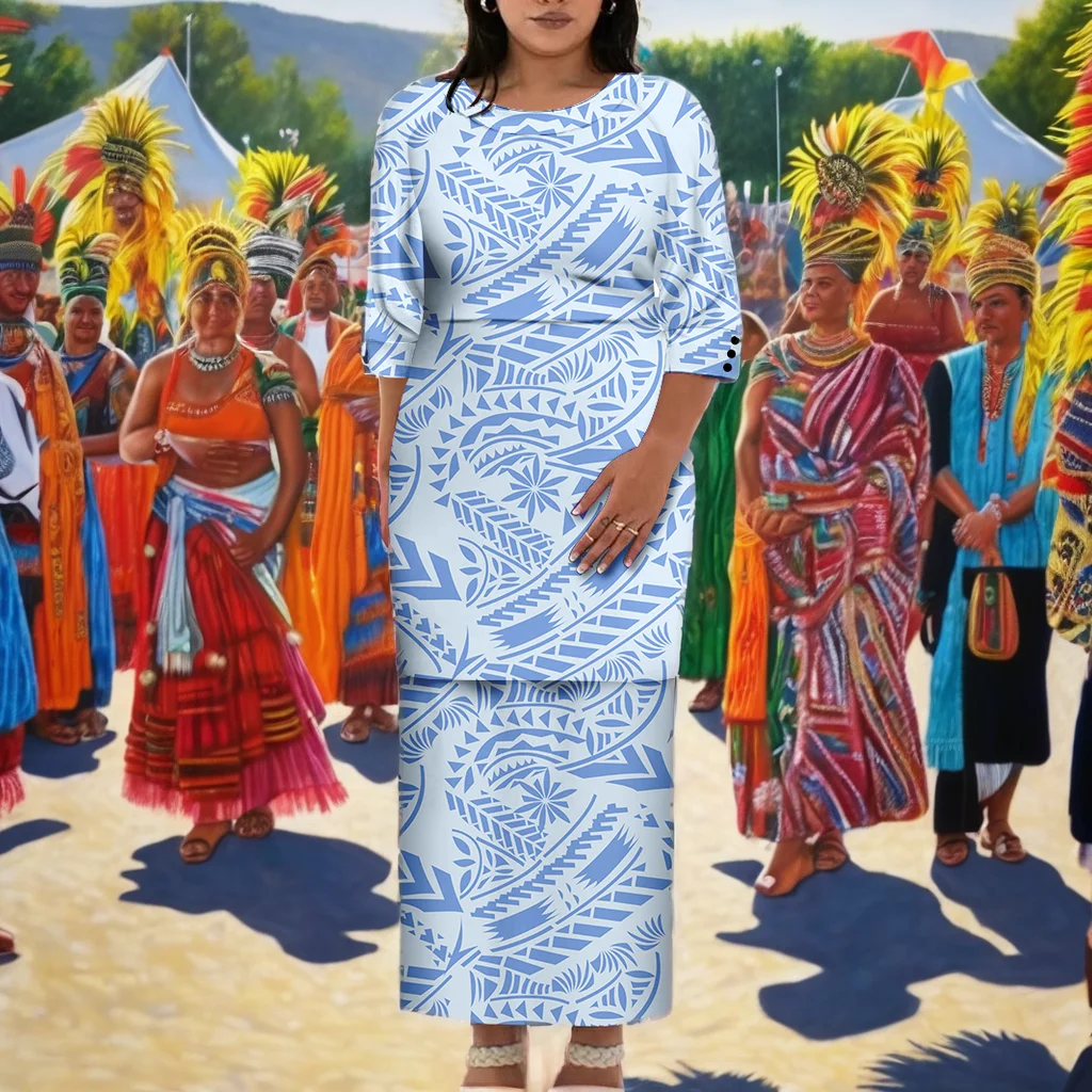 Customize New Wholesale Custom Summer Pacific Island Art Design Samoan Puletasi Set Plus Size Women Neck Button Design Quick Dry