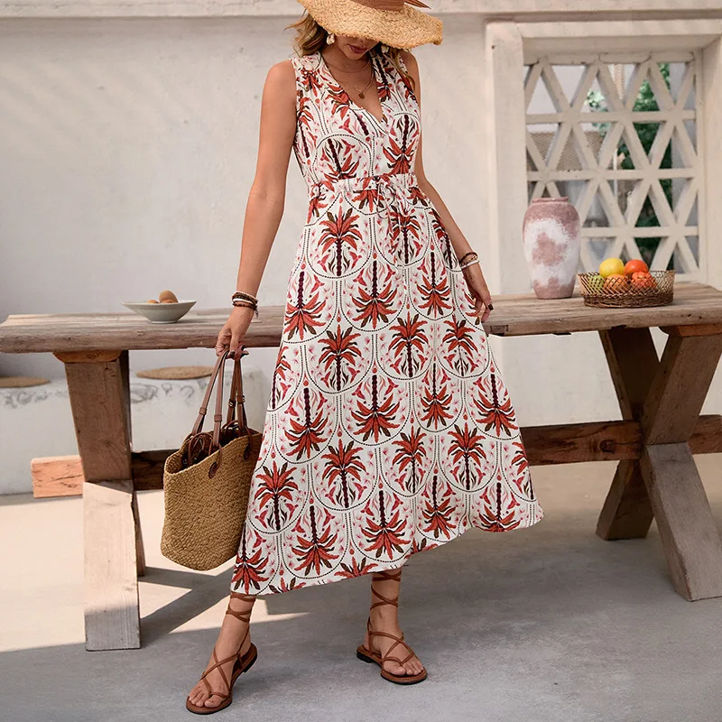 Tiktok Cross-border Summer Hot Sale New Holiday Style Casual High Waist Printed Sleeveless V-neck Long Dress Women