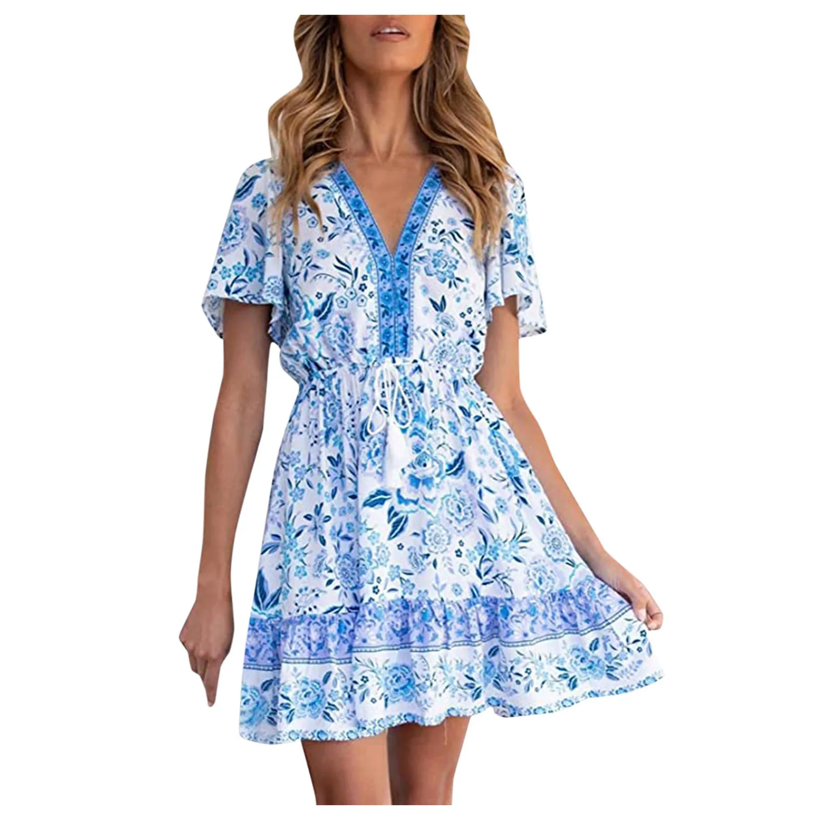 Boho Dress Summer Casual 2023 V Neck Floral Bohemian Beach Dress Women