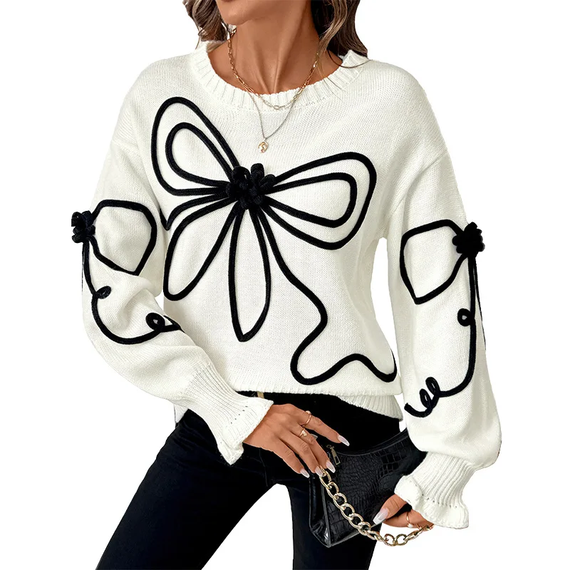 A 2025 New Autumn and Winter Cross-border Playful and Sweet Style Loose Bow Decorated Round-neck Sweater for Women