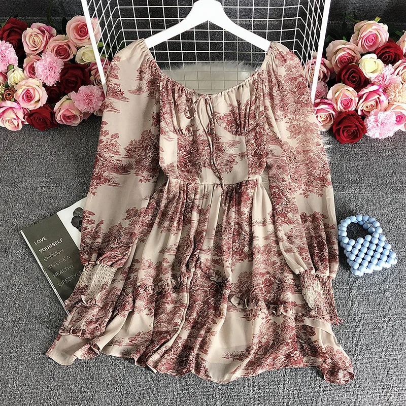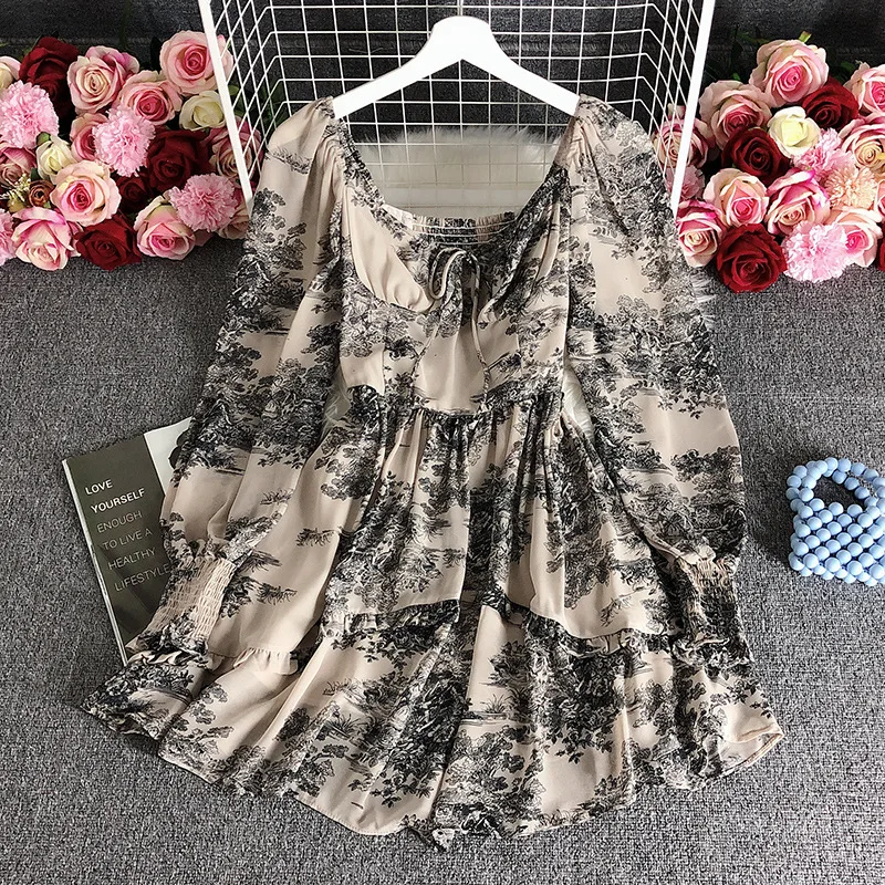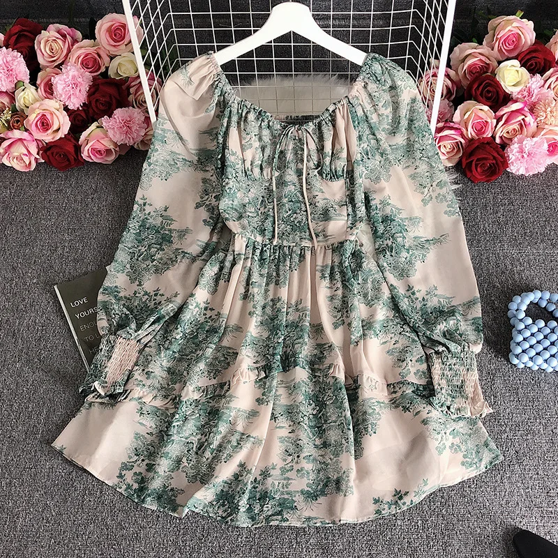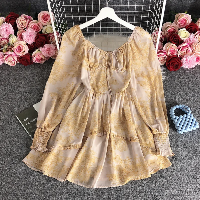 Retro square Neck Dress 2025 Summer New Long Sleeved Waist Cinching Slimming Temperament Small Floral Skirt