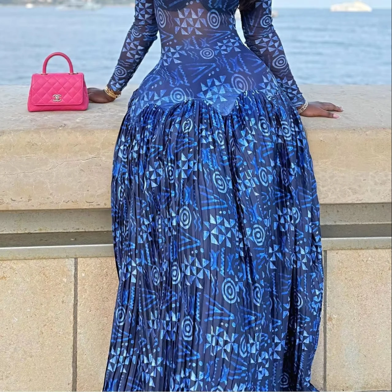 ZYHT 73963 Matte Satin Printed Geometric Pattern Maxi Women Asymmetric One Shoulder Ruched Hem Women Dress