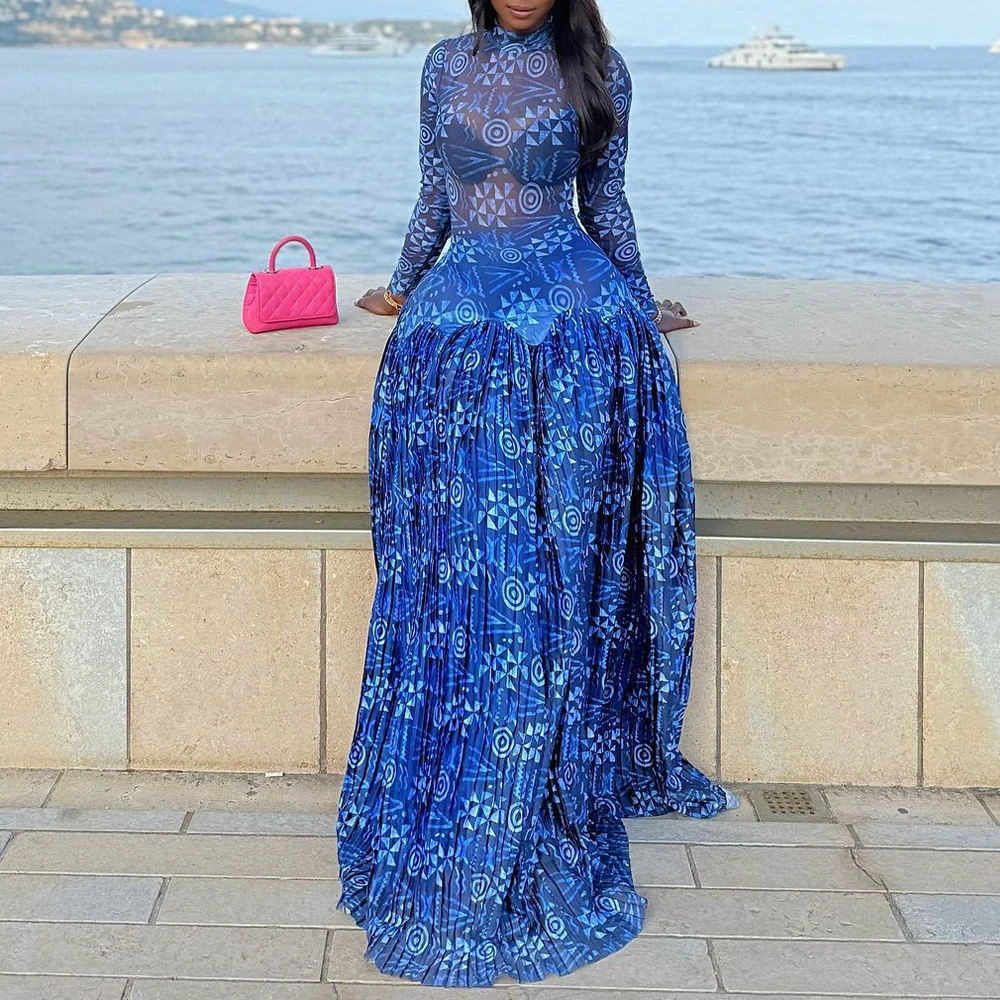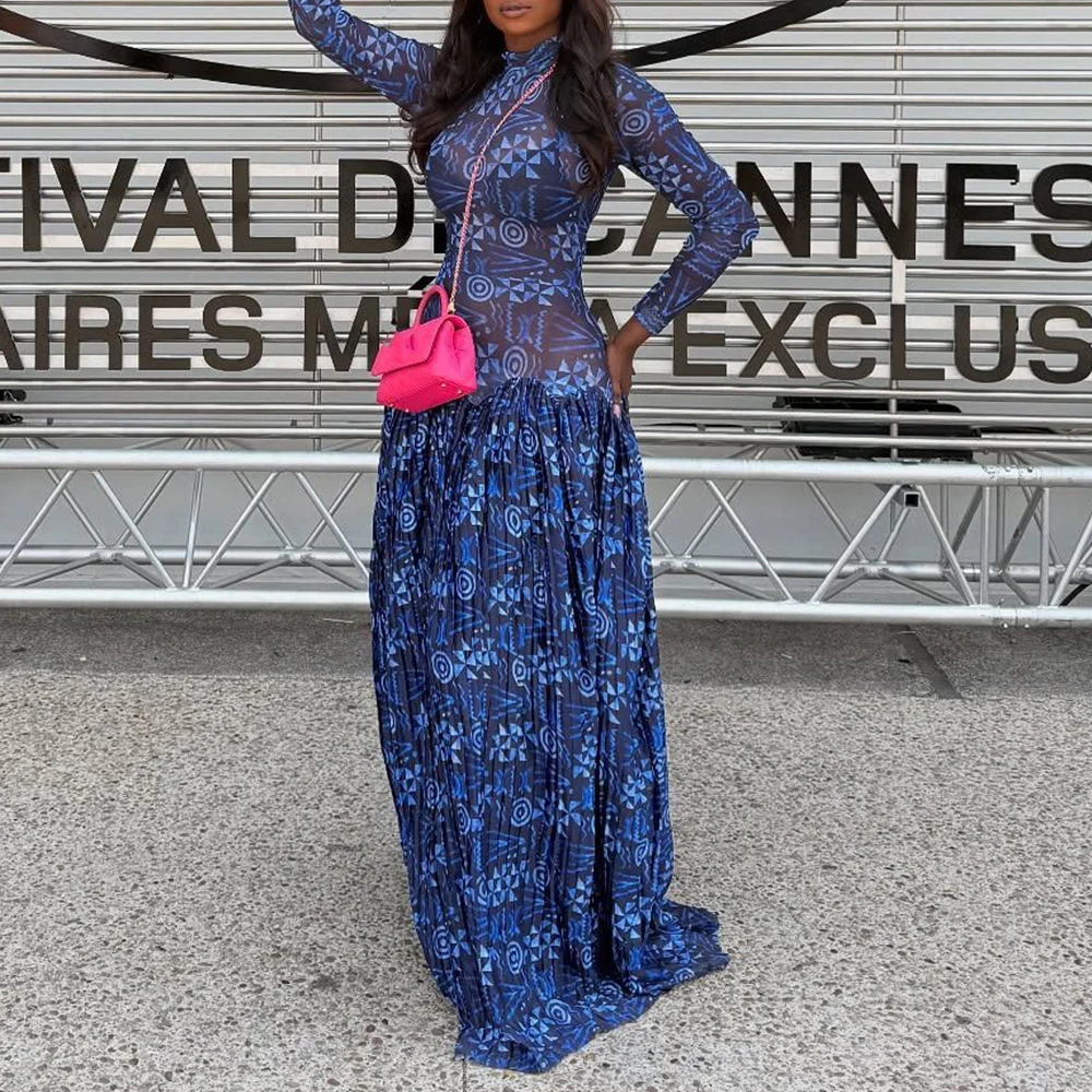 Women Long Sleeve Tie Dye Print Turtleneck Big Swing Midi A-line Long Maxi Dress 2026 Elegant Evening Birthday Party Dresses