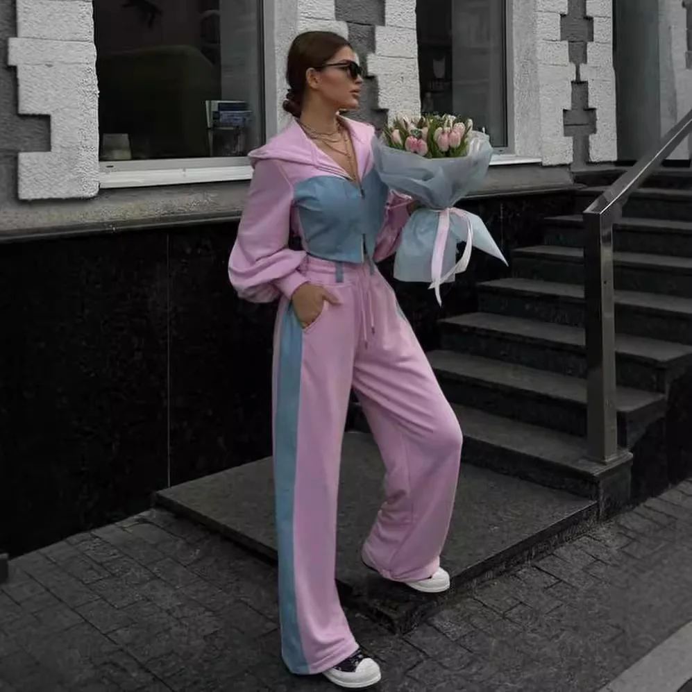 2025 Autumn Lady Fashion Tracksuit Women Slim Zipper Short Hooded Coats Lace up Wide Leg Pant Casual Contrast Hoodies Pants Sets