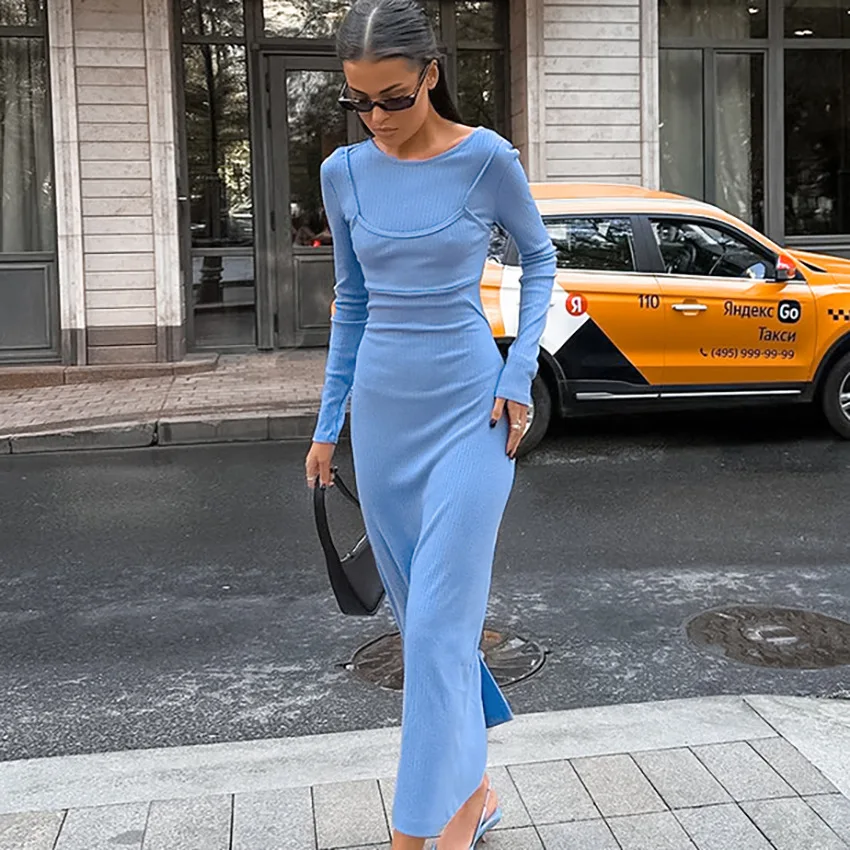 2024 Autumn Fashion O-Neck Long Sleeve Straight Dresses Female Elegant Patchwork Slim Elastic Dresses Knitted Blue Long Dress