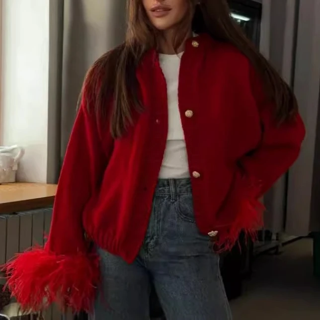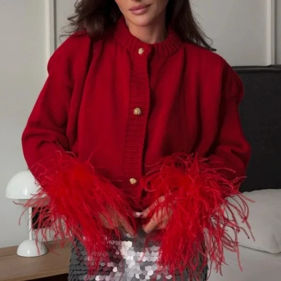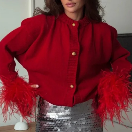 Fashion Feather Patchwork Knitted Cardigan Women Elegant Street Tops Long Sleeve Single Breasted Short Loose Sweater Coats