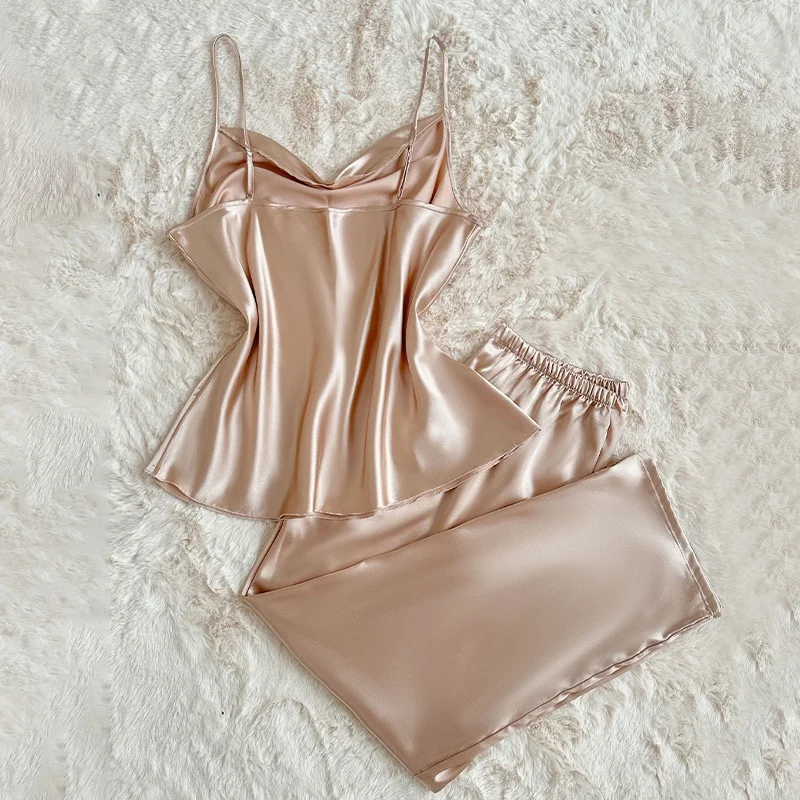 Two-Piece Elastic Waist Solid Casual Suspender Pants Set Fashionable Ice Silk Pajama Comfortable Satin Material Spring
