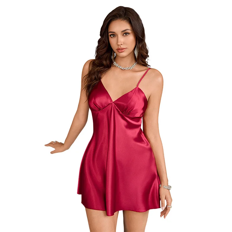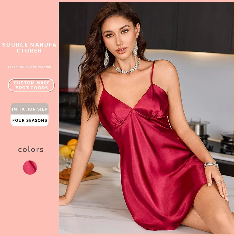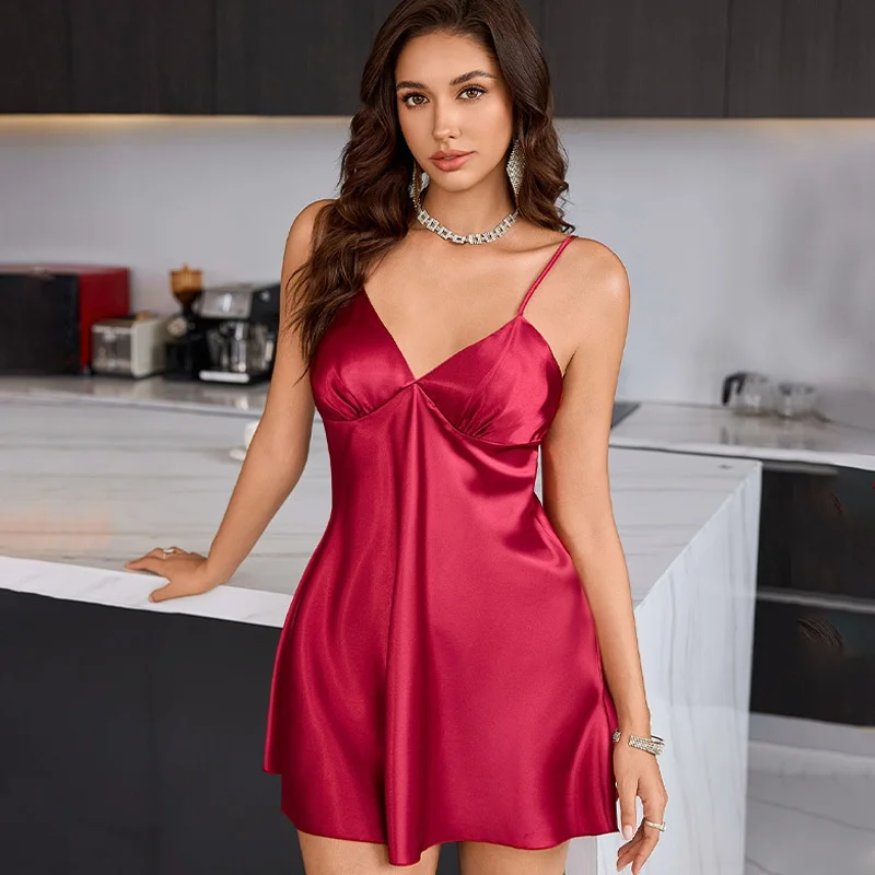 Women's Summer Breathable Home Casual Short Nightdress Comfortable Ice Silk Satin Dress Elastic Waist Closure Solid Sexy Style