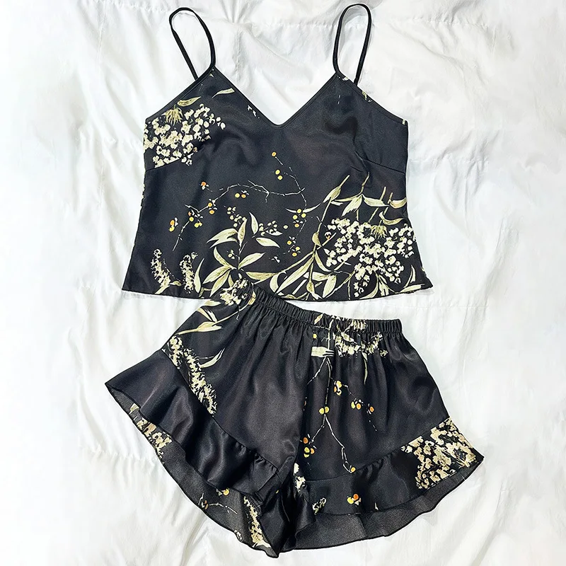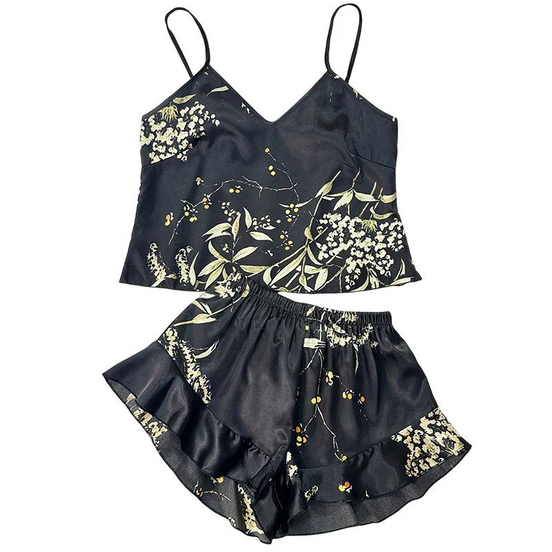 Women's Summer Satin Tie-Up Robe Nightgown Two-Piece Set Breathable Elastic Waist Thin Style Camisole Simple Printed