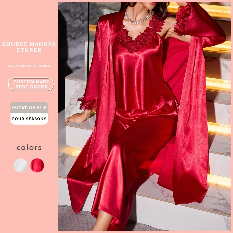 Three-Piece Set Sexy Solid Satin Pajamas Elastic Waist Summer Comfortable Camisole and Long Pants Nightgown