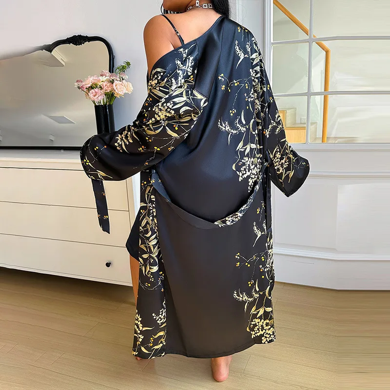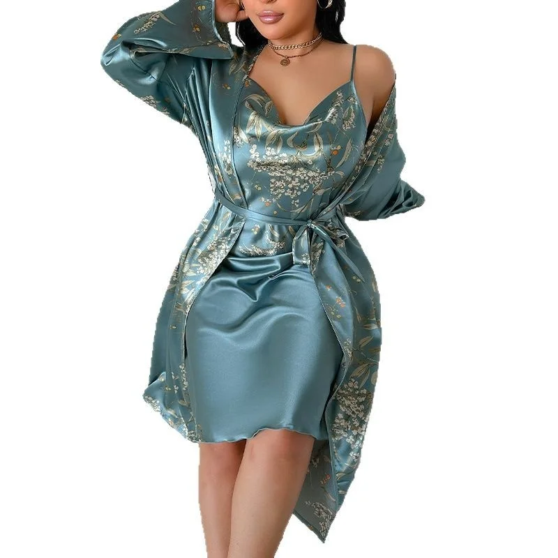 Plus Size Satin Two-Piece Set Sexy Printed Lace-Up Robe and Nightgown Elastic Waist Home Wear; Casual Summer Pajamas