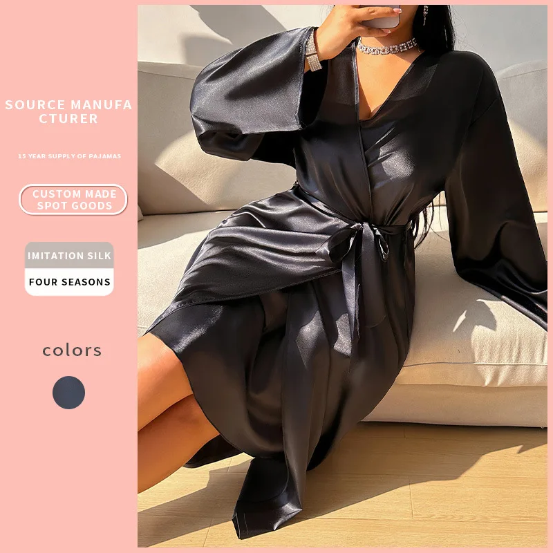 Women's High-End Mid-Length Nightgown Breathable Ice Silk Elastic Waist Casual Cross-Border Thin Lace-Up Homewear for Spring