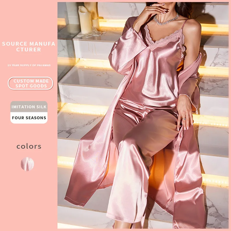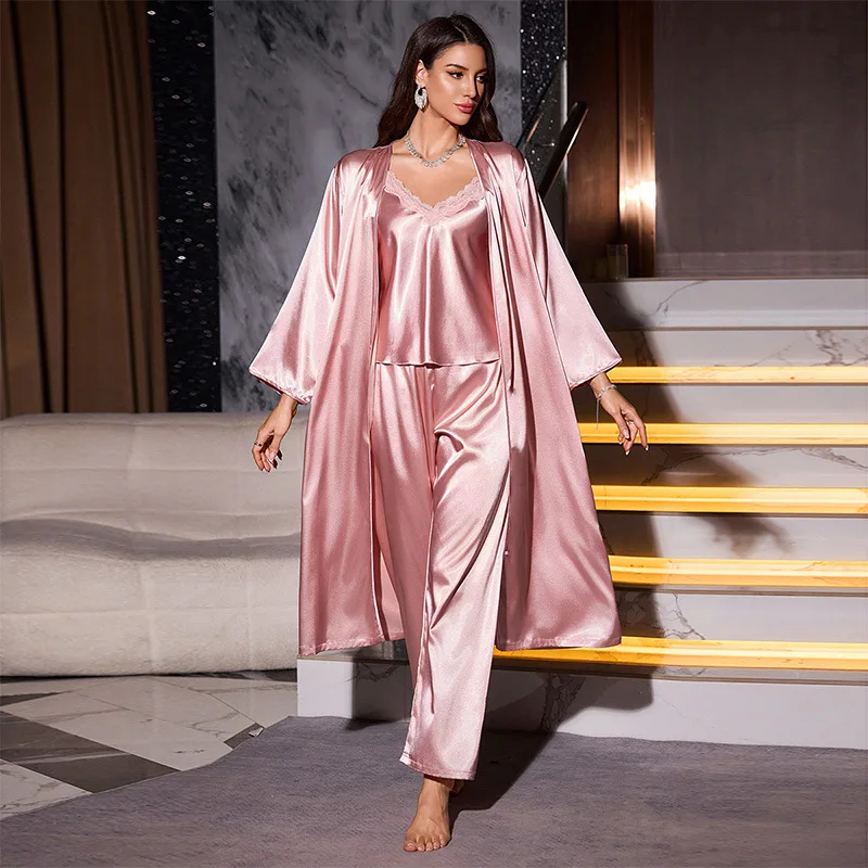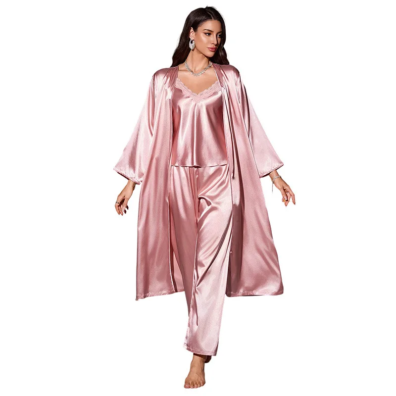 Three-Piece Satin Robe Nightgown Simple Casual Sexy Strap Shorts Elastic Waist Solid Pattern Knee Length Summer Fashion