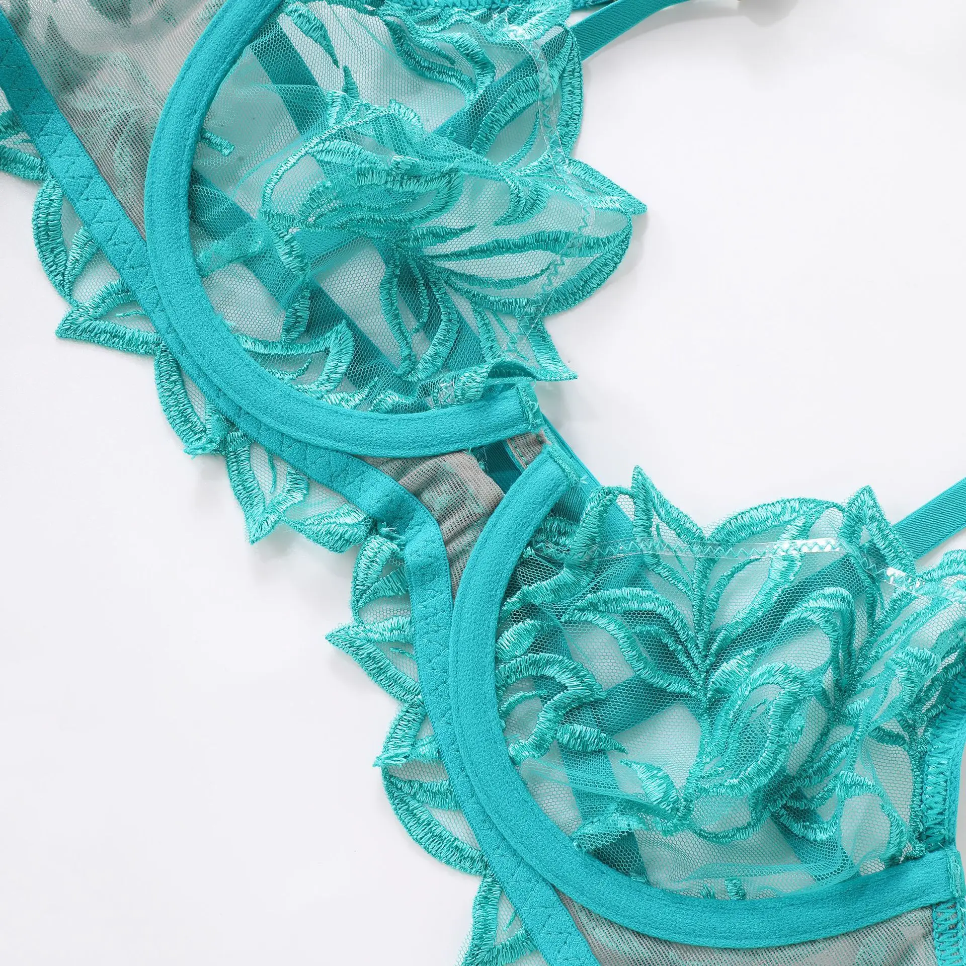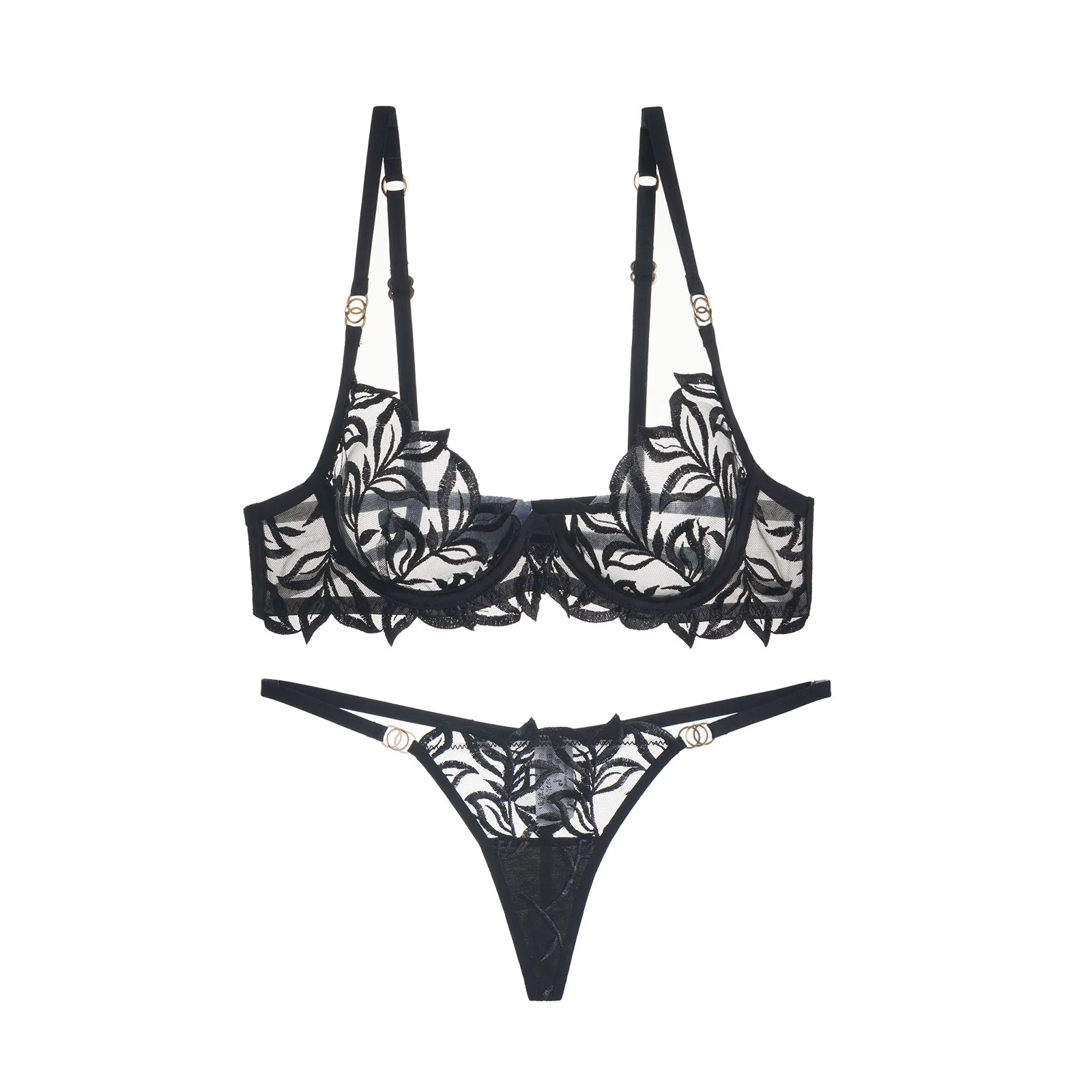 JENGS New Product Embroidery See Through Underwire Bra Panty Sexy Lace Mesh Sheer Lingerie Push up Bra and Thong Panties Sets