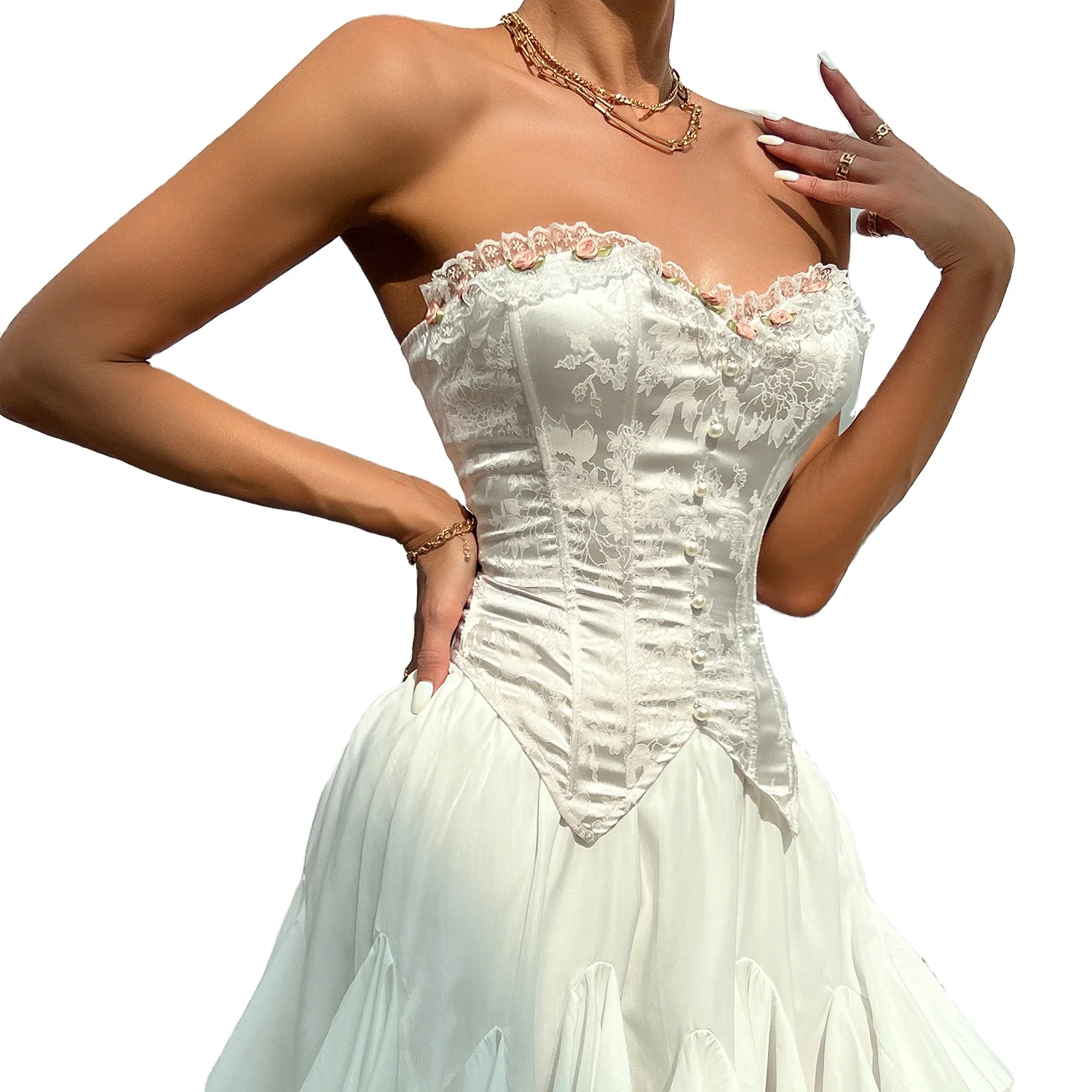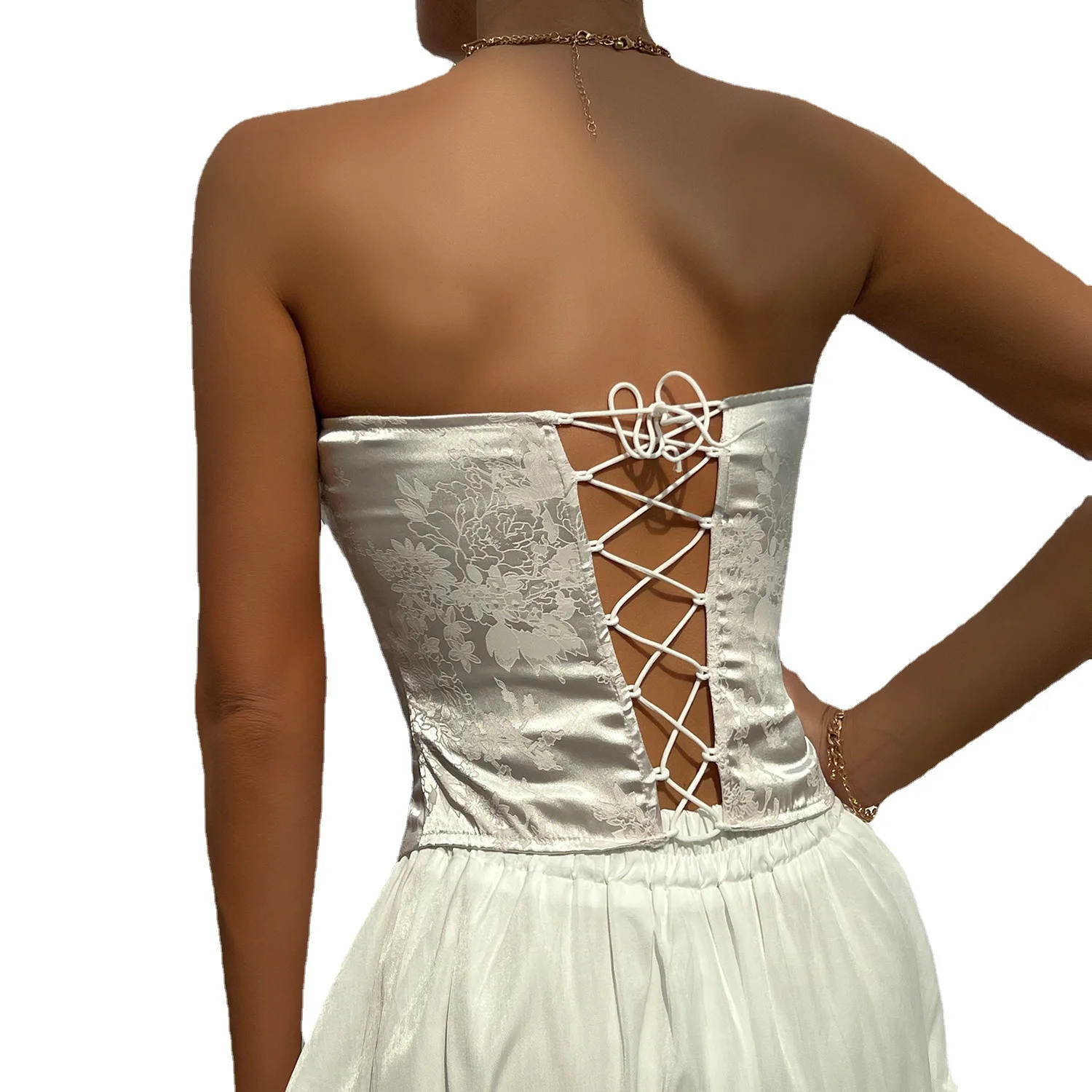 JENGS High Quality Sexy Low-cut Backless Jacquard Splicing Lace Chest-wrapped Flower Waist Corset De Mujer White Lace Coquette Corset