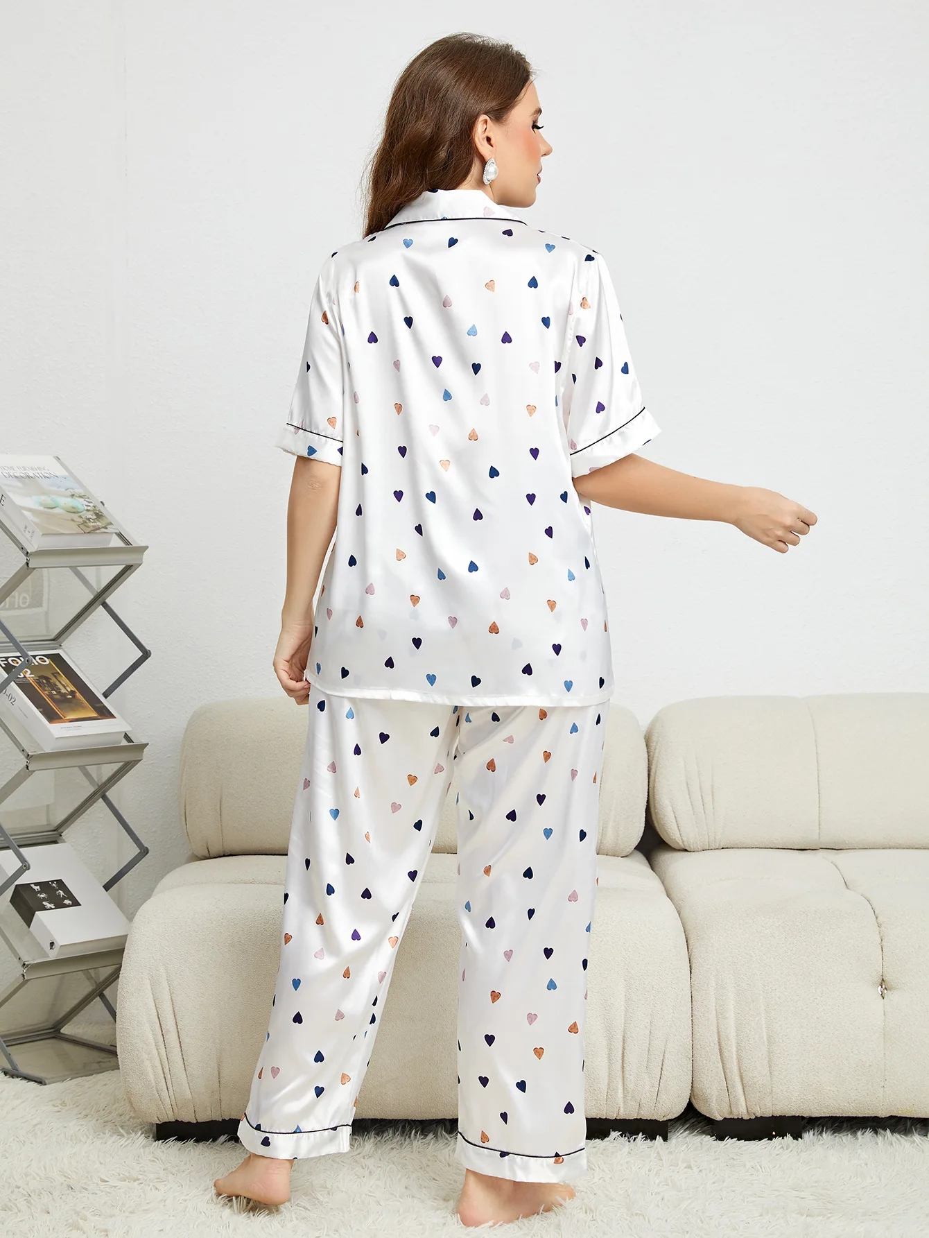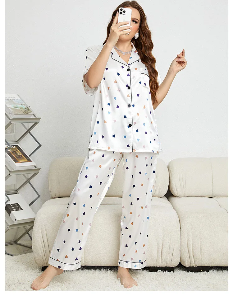 JENGS 2025 New Product Casual Plus Size Print Heart White Silk Pajamas for Women Set Pants