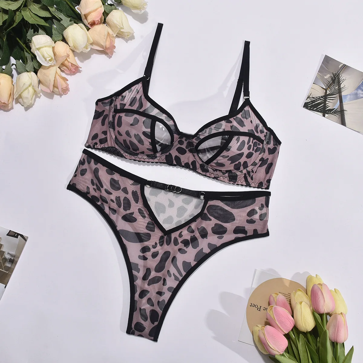 JENGS New Leopard Print Wire Free Bra and Panties Transparent Comfortable Women Full Cup Bra Sexy Underwear Set with Waist