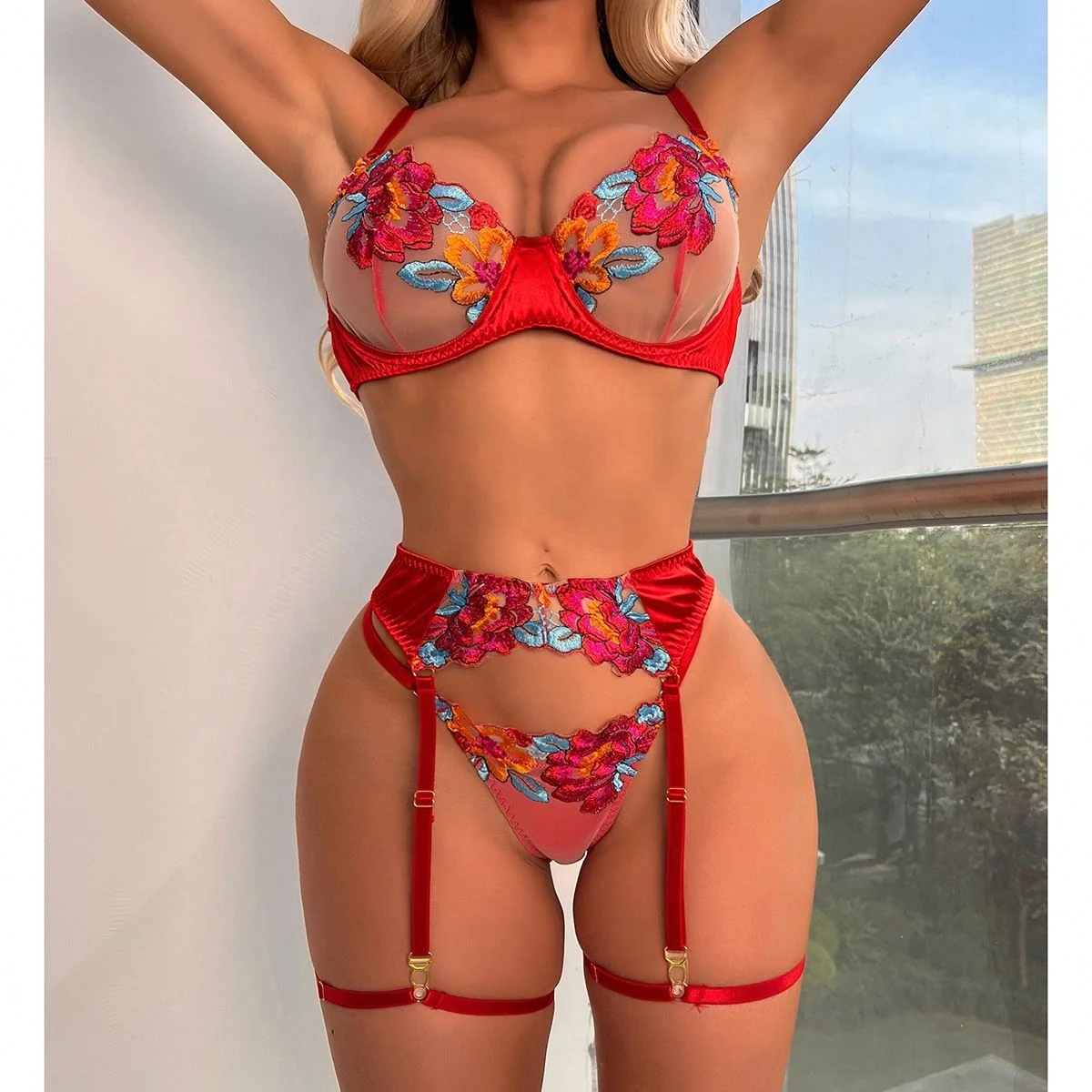 JENGS Private Label Vendor Flower Embroidered Lingerie Hot Transparent Women Royal Blue Sexy Lace Lingerie Set