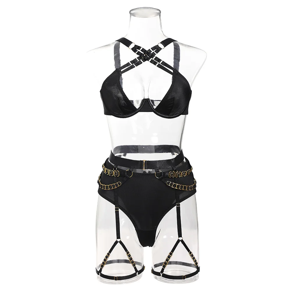 New Collection Women's Solid Color Sexy Three-Piece Set Push-Up Bra Waist Garter with Embroidery Lace Ruffles Decoration