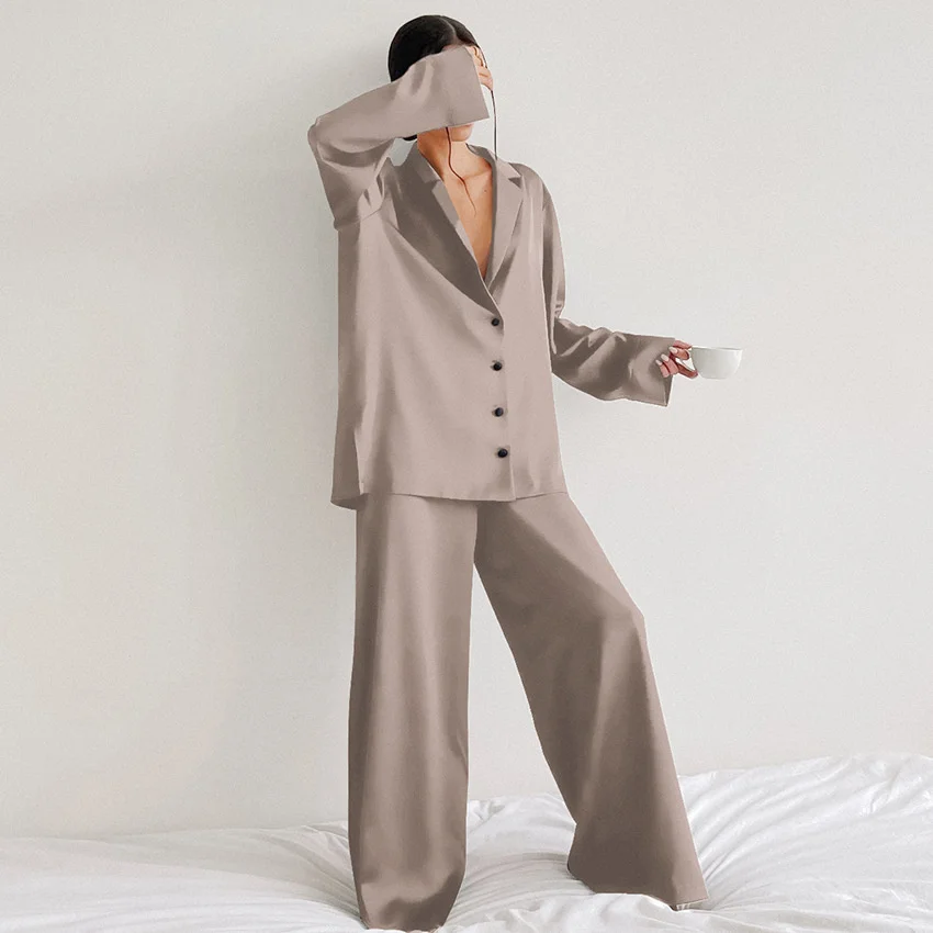 Jengs Ice Silk Pajamas Casual Sleepwear Turn-down Collar Long Sleeve Pants Set Women Sleepwear Wholesale Nightgowns