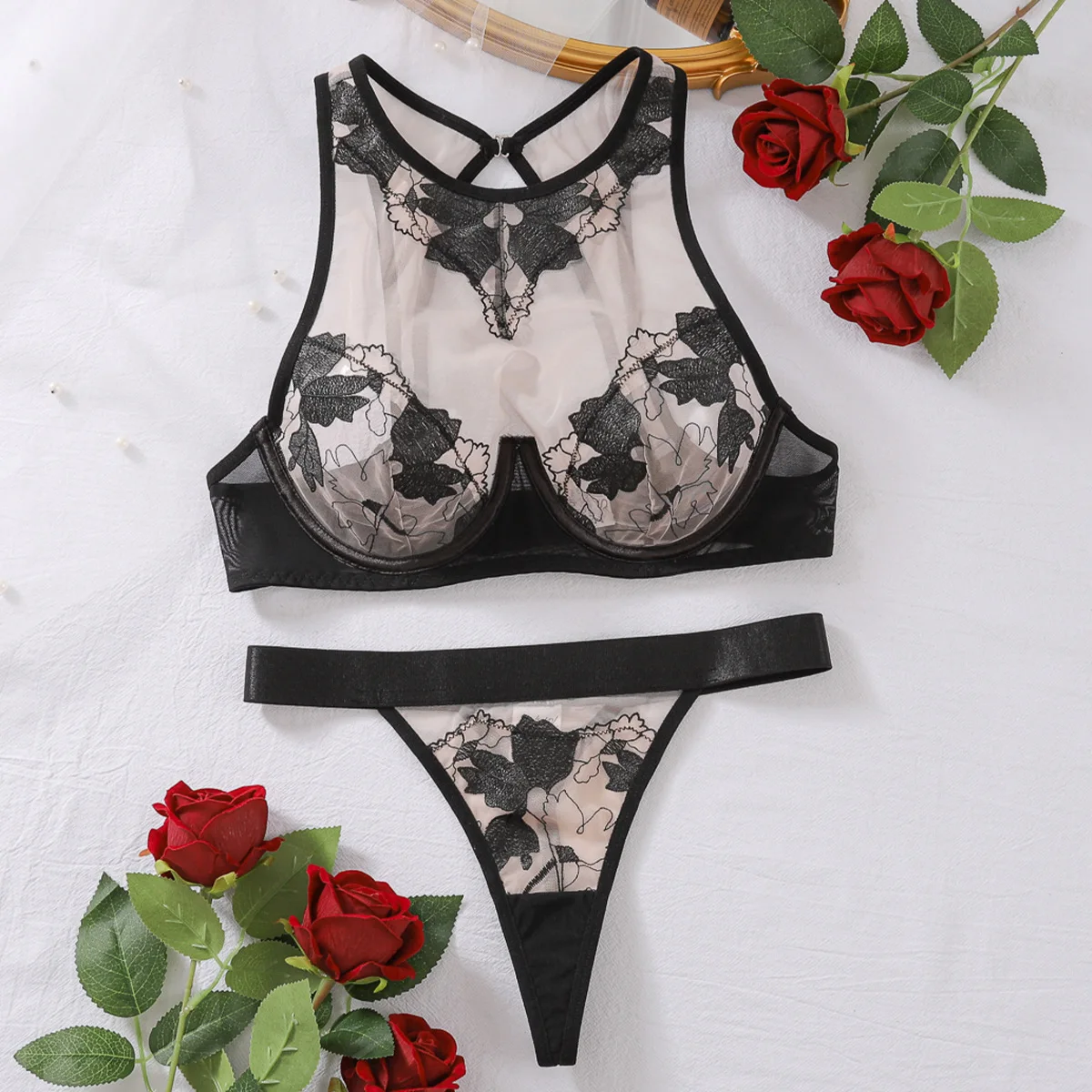 Customized New Fashion Sexy Lingerie Color Blocking Floral Embroidery Spliced Mesh Bra Underwear 2pcs Lingerie Sets