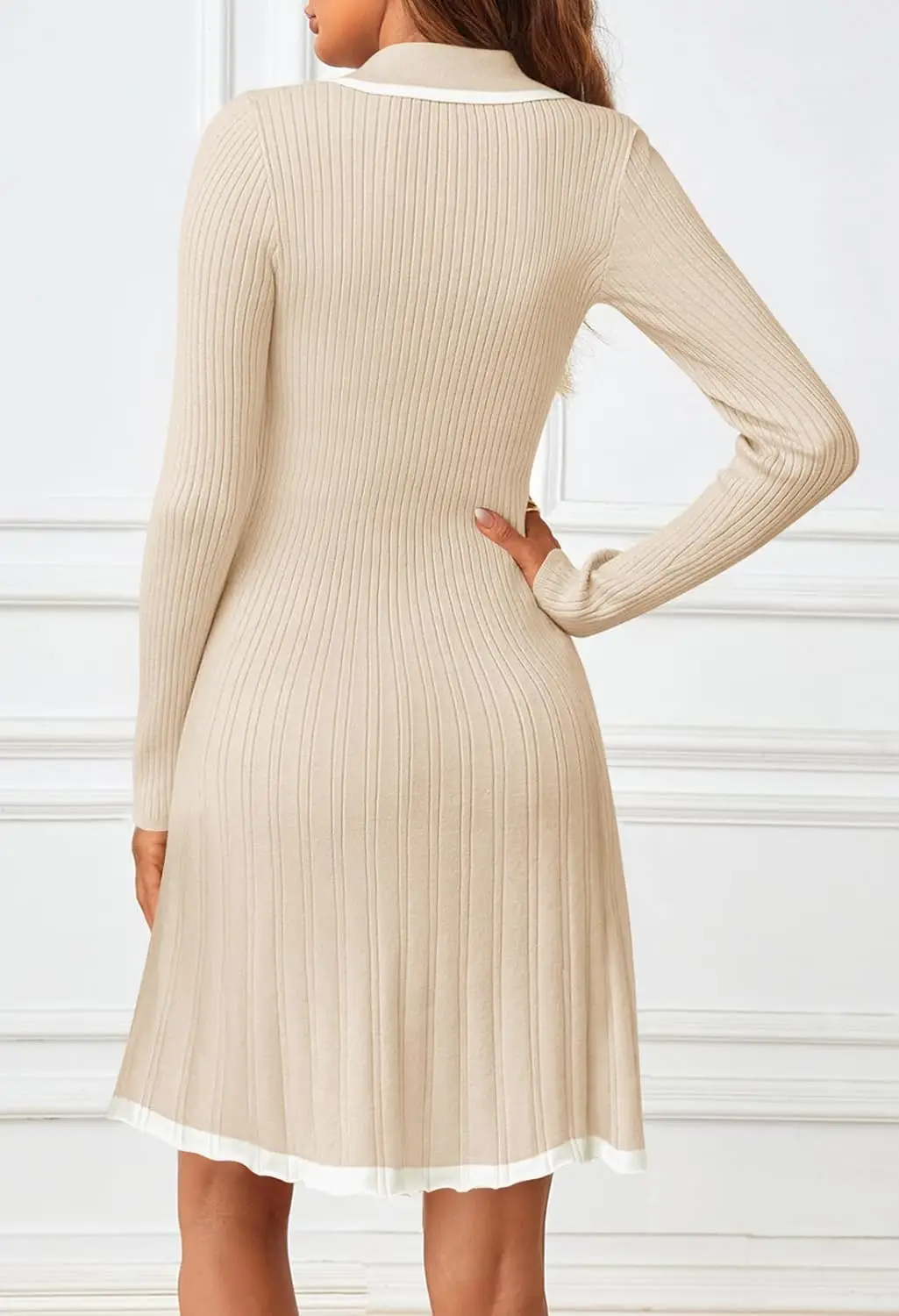 Women's Casual Simple A-Line V Neck Sweater Dress Long Sleeve Button Knit Pleated Mini Work Solid Made Viscose Natural Waist