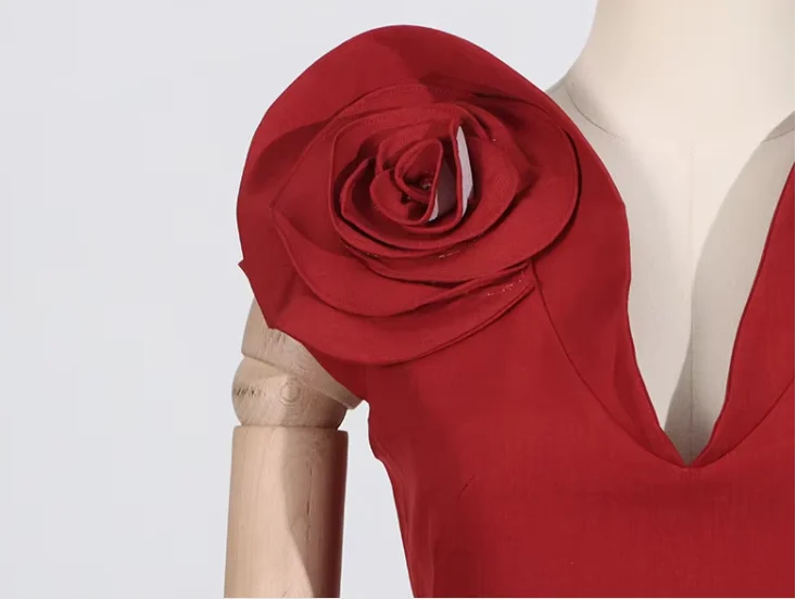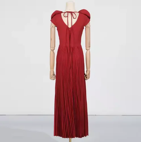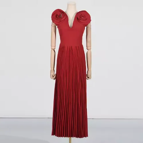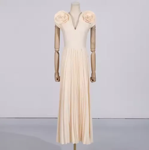 Elegant Luxury Women's Leisure Gown New Arrival Slim Fit Midi Dress Deep V-Neck Pleated Lace Decoration Natural Sexy Washable