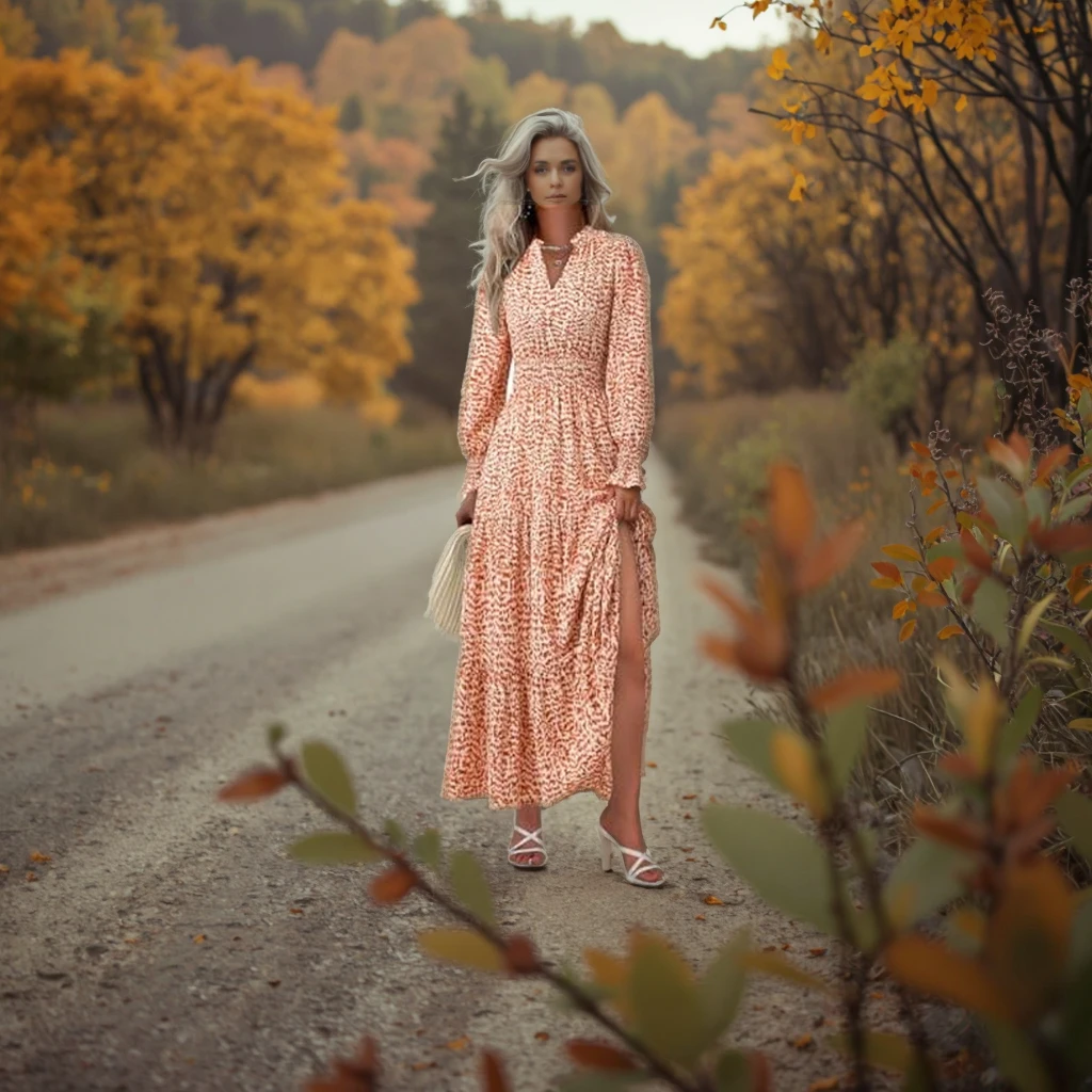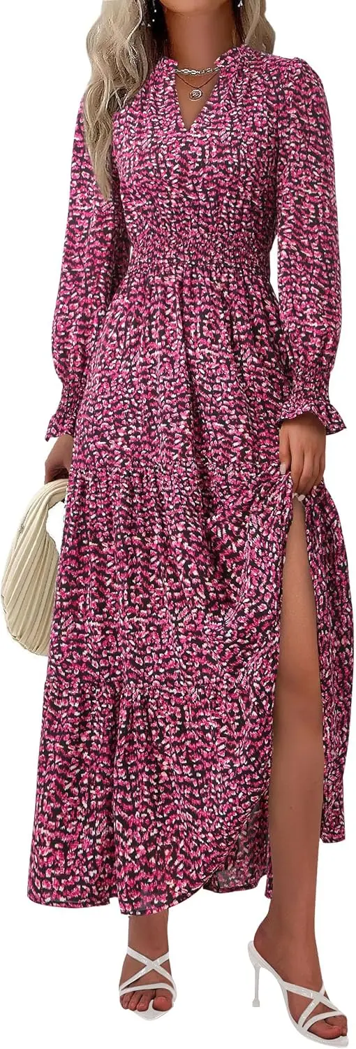 Women's Autumn Floral Chiffon A-line Maxi Dress V-Neck Long Sleeve Casual Natural Plain Dyed Flowy Boho Style Party Woven 100%