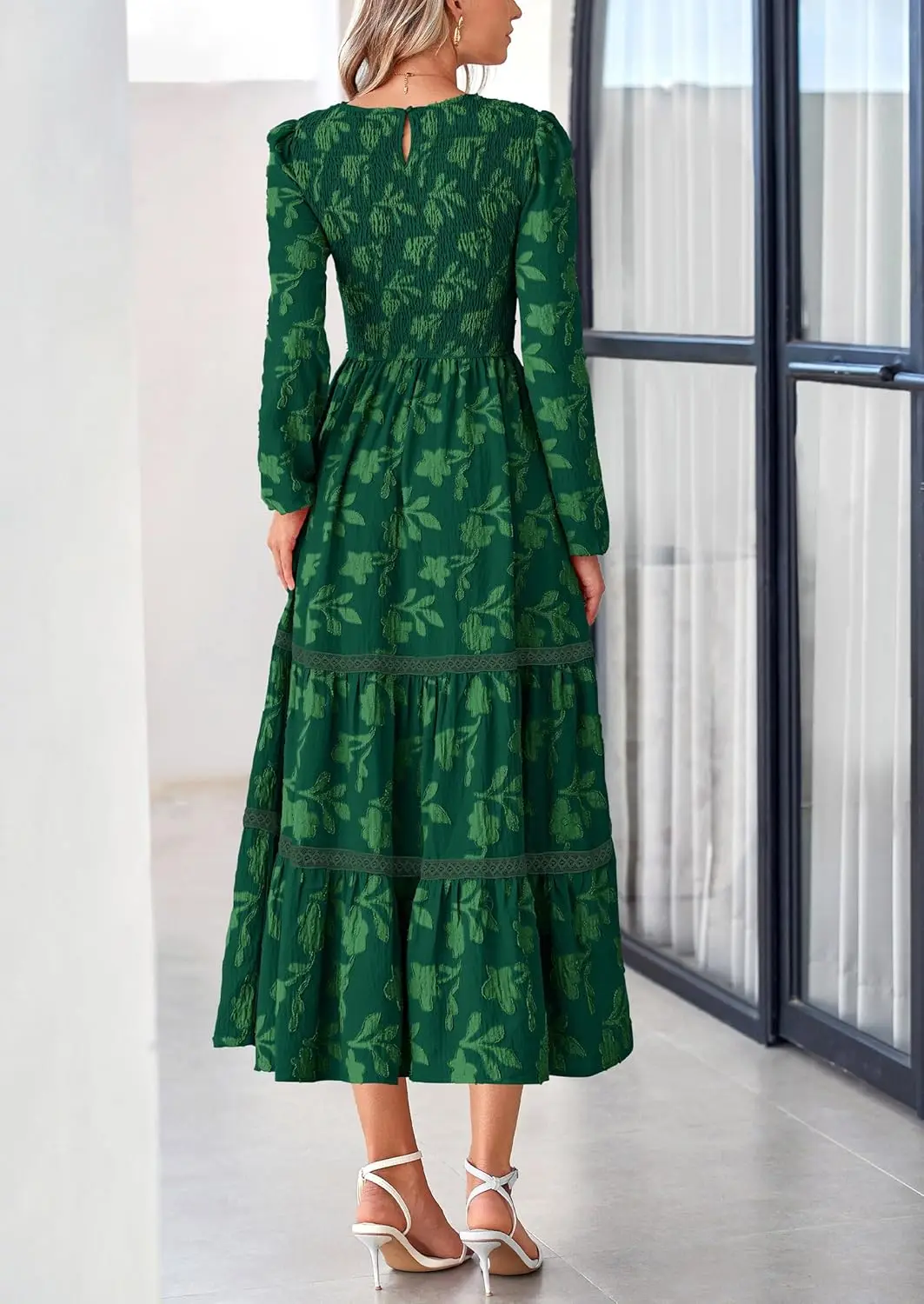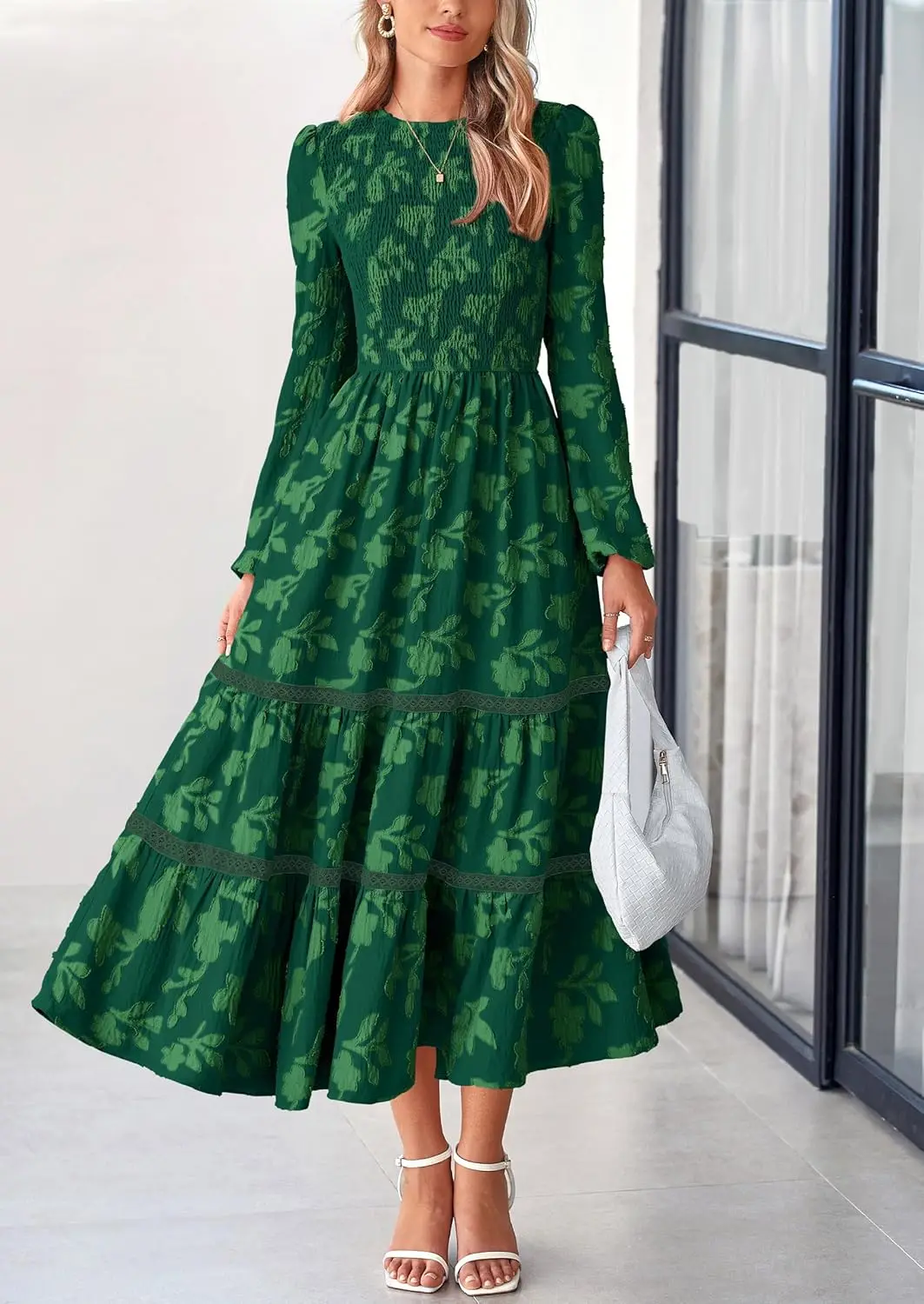 2025 Fall Women's Elegant Modest Floral Boho Midi Dress Long Sleeve Chiffon Casual Wedding Dress Natural Smocked Flowy Washable