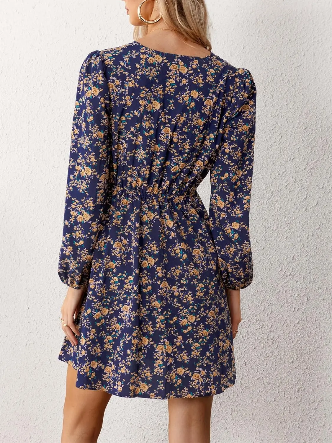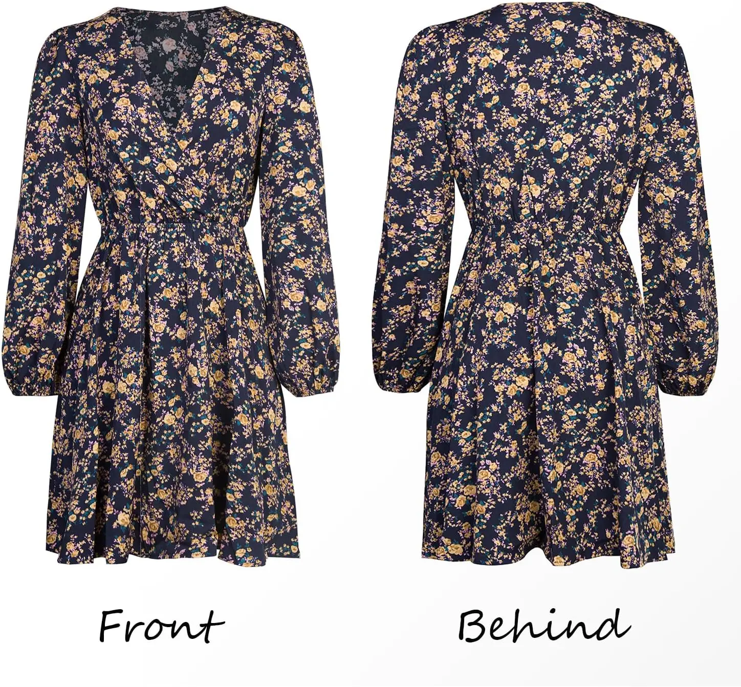 Women's Casual Summer Dress Floral Ruffle Satin Surplice V Neck Long Peasant Sleeve Elastic Natural Waist Mini Flowy for