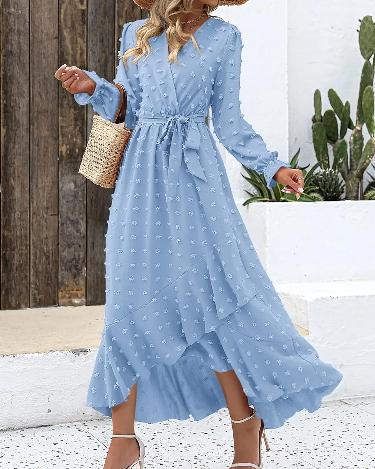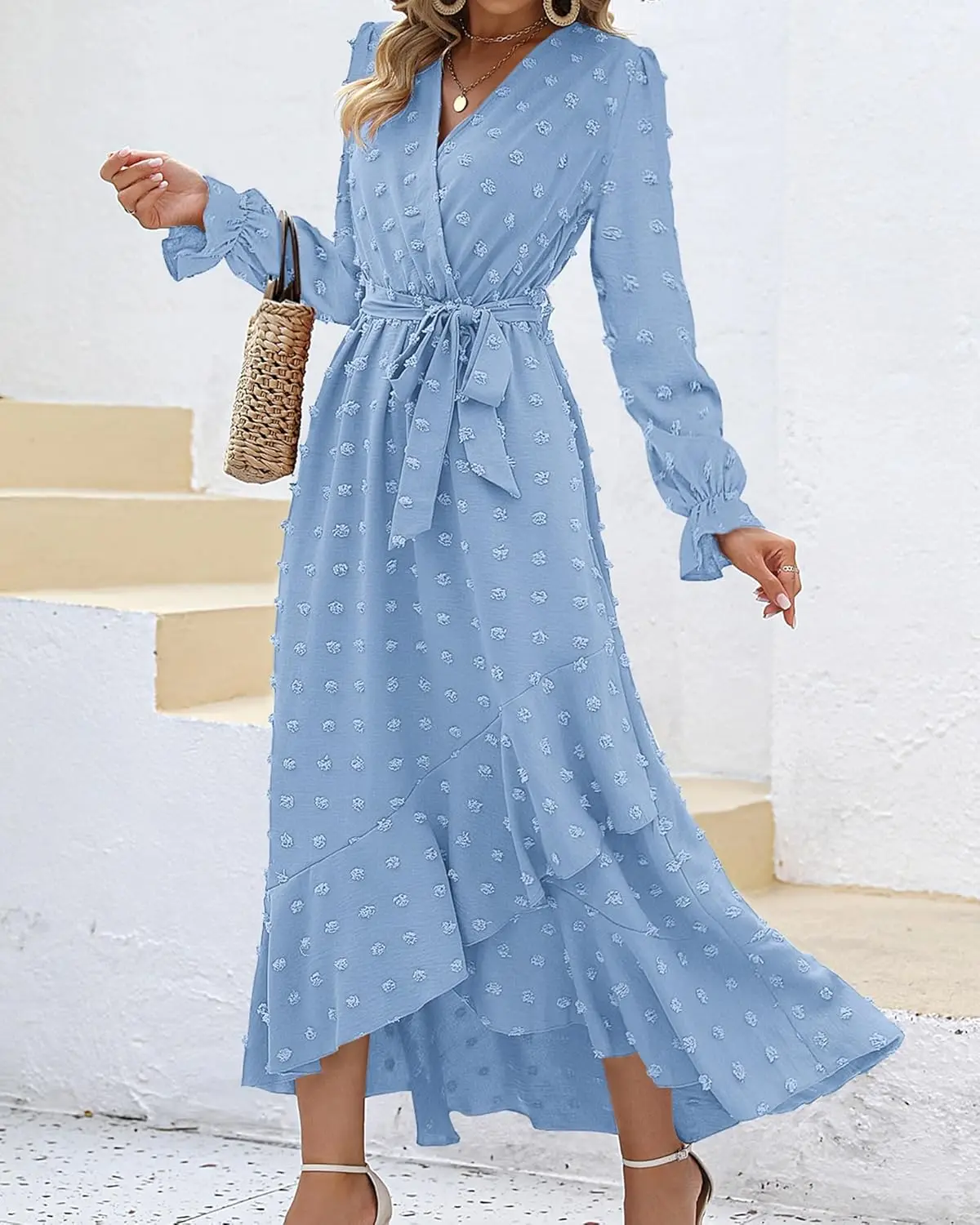 2025 Women's Casual V Neck Maxi Dress Floor-Length Long Sleeves Boho Slit for Swiss Dot Print for Fall Weddings Cocktail Parties
