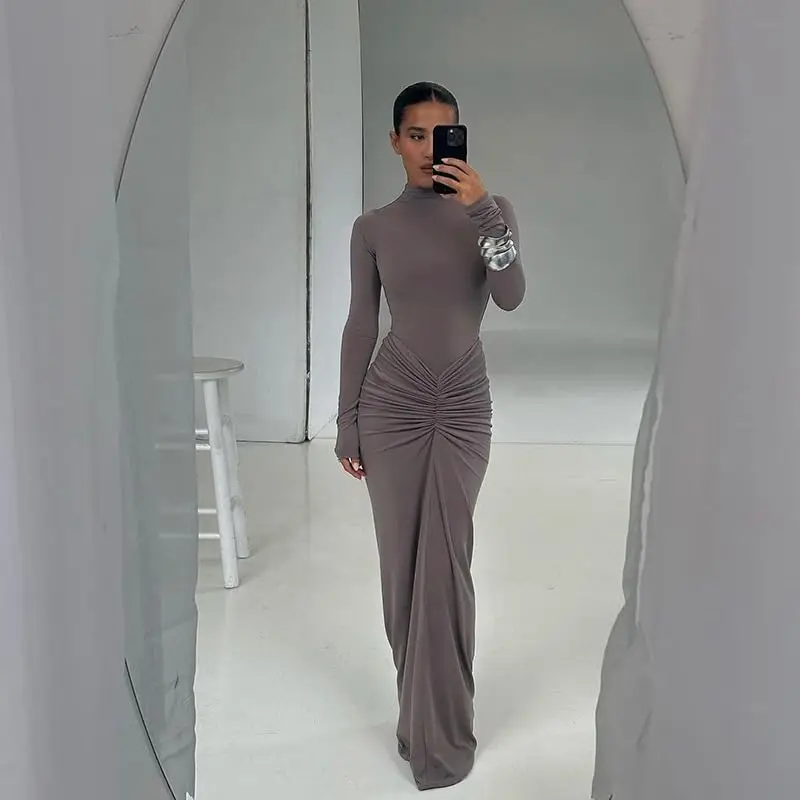Women's Breathable Satin Maxi Dress Casual Floor-Length Bodycon Long Sleeves Turtleneck Autumn Solid Pattern for Club Natural