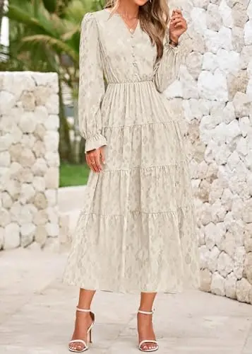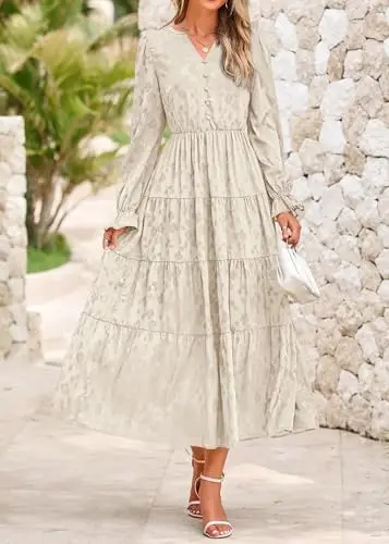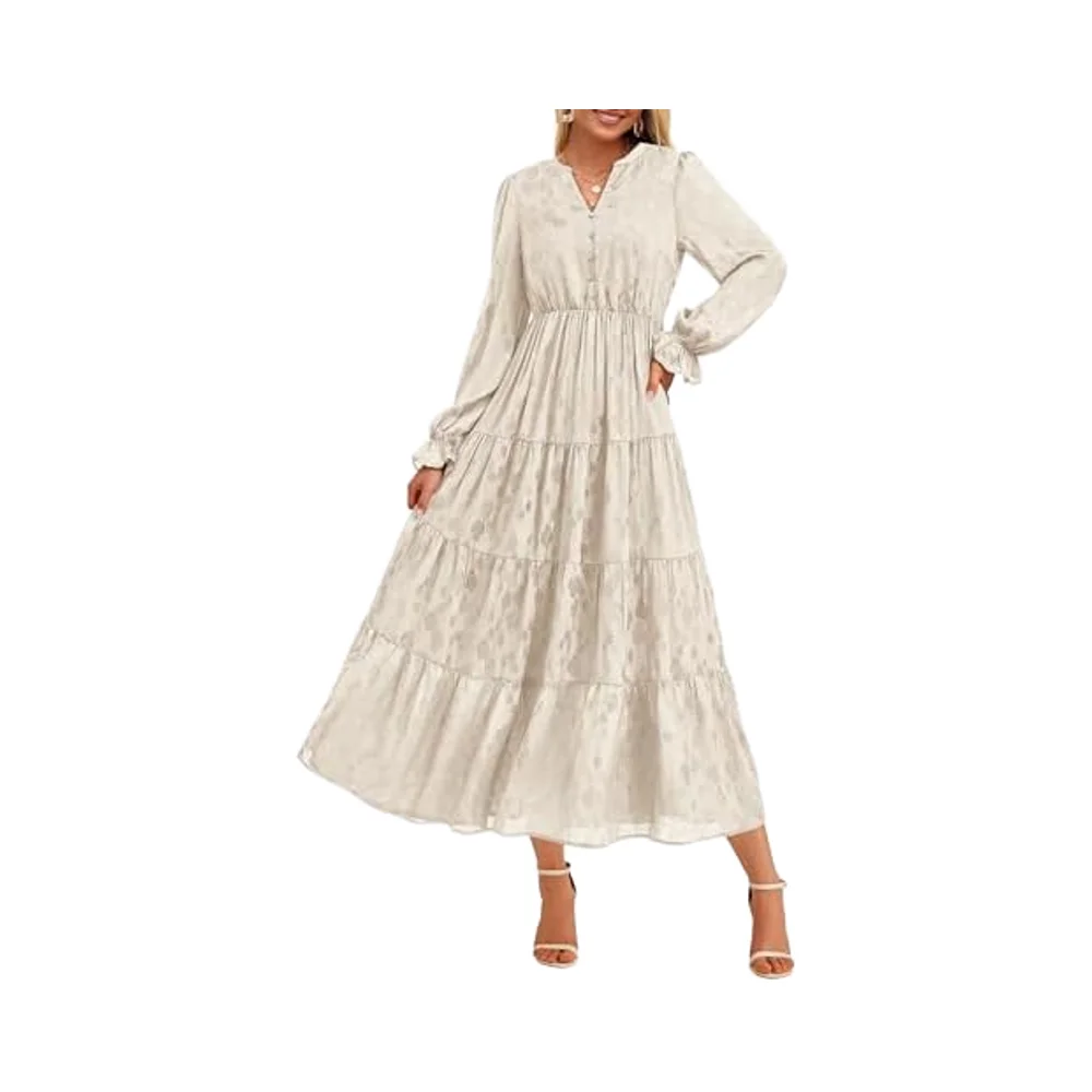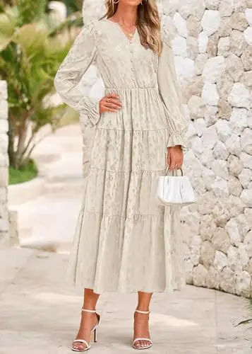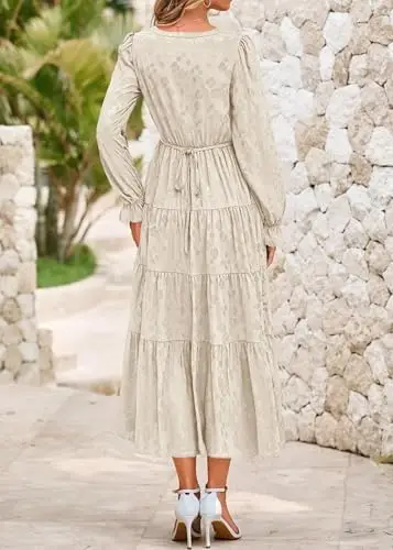 Women's Elegant Classy Satin Maxi Dress with Long Sleeve Empire Waist Ruffle Tiered Flowy Design Floor-Length for Fall Weddings