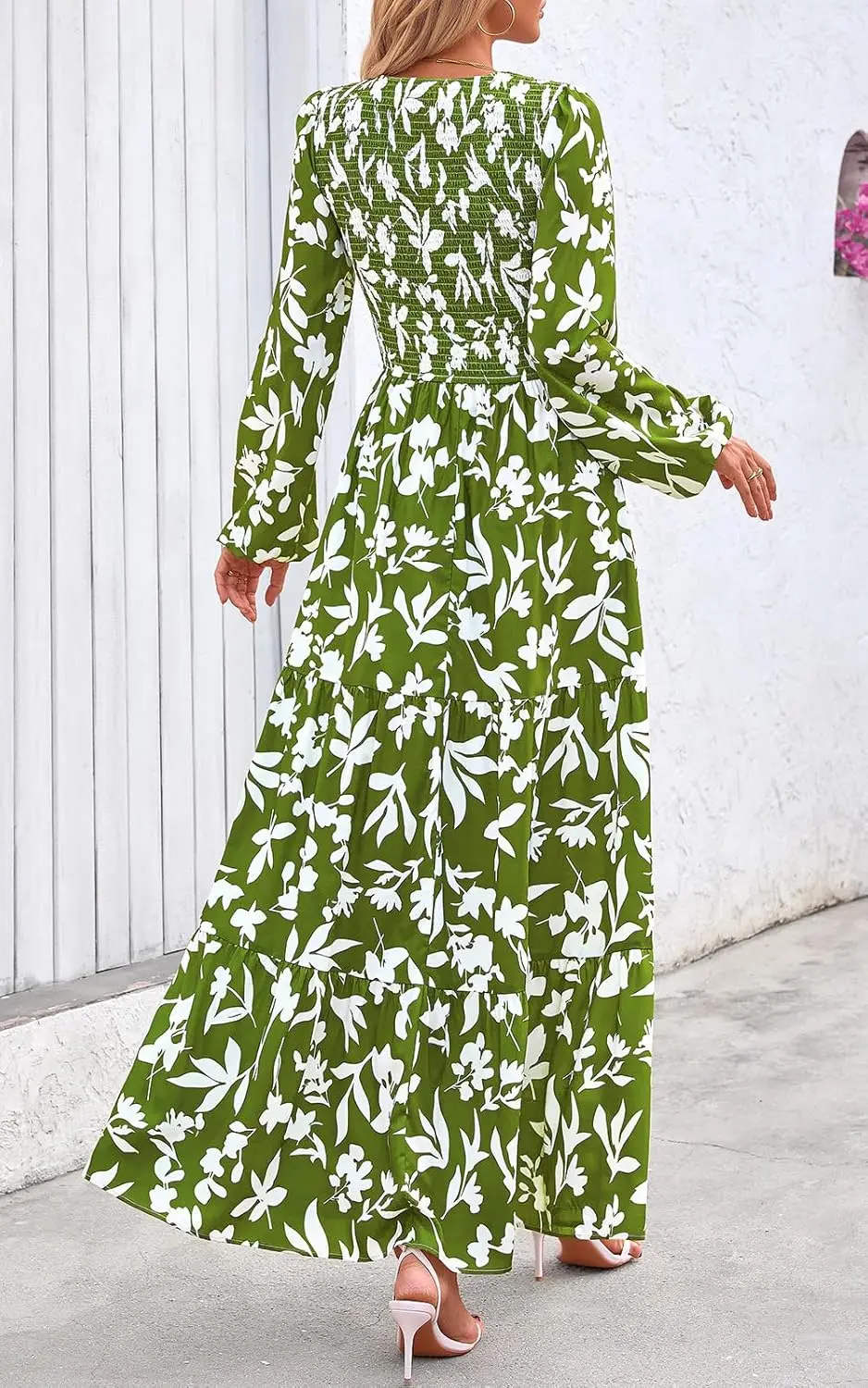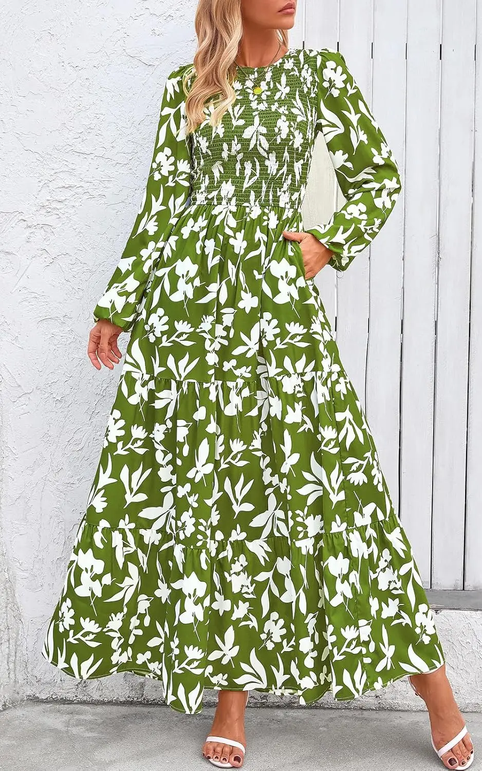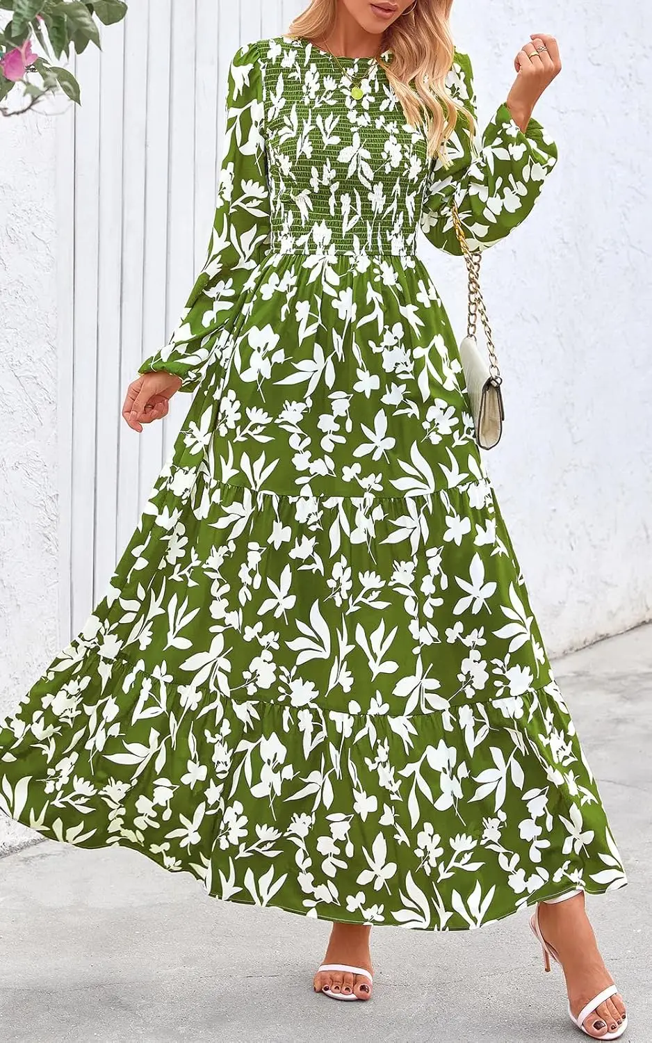 PRETTYGARDEN 2025 Women's Floral Satin Maxi Dress Summer Flowy Long Sleeve Casual O-Neck Smocked Tiered Floor-Length Natural