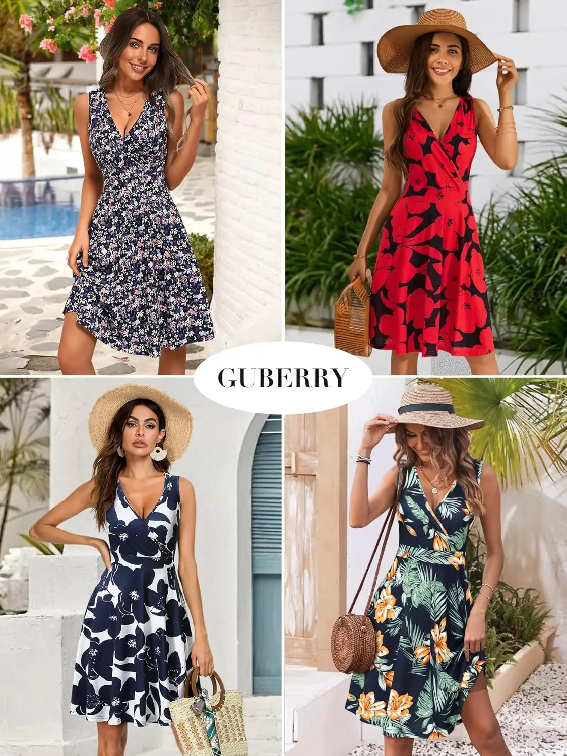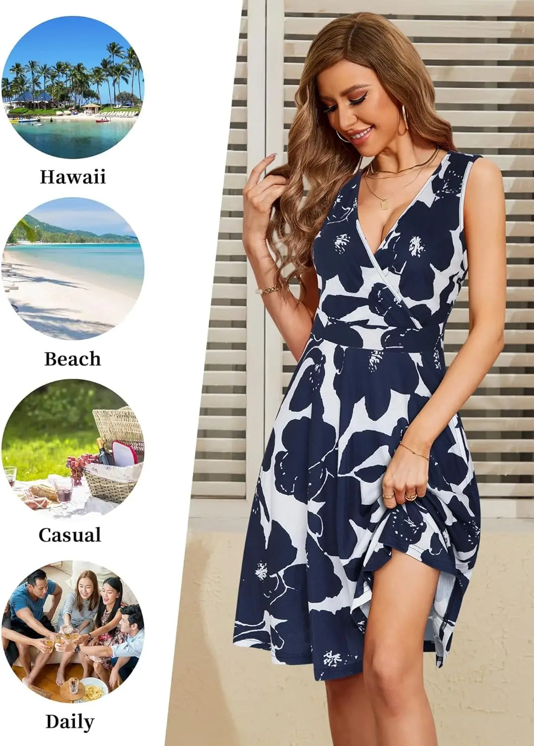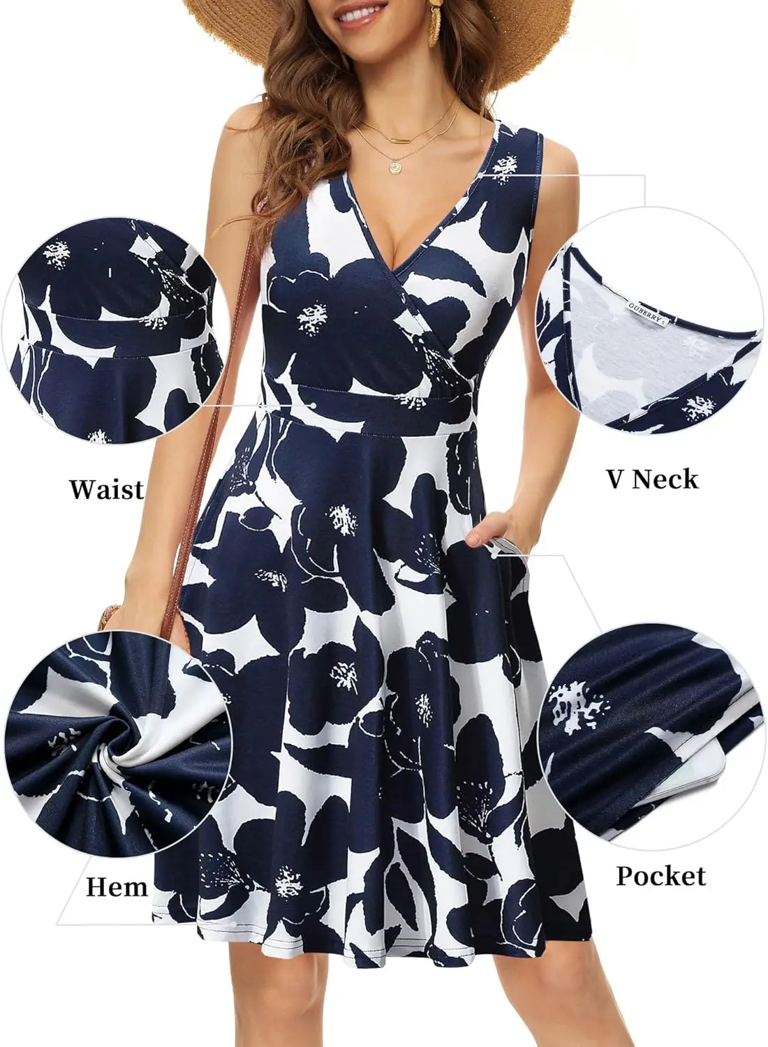 Women's Casual Summer Sundress Floral Flare Tank Knee-Length Spaghetti Strap V-Neck Sleeveless Wrap Pockets Natural Waistline
