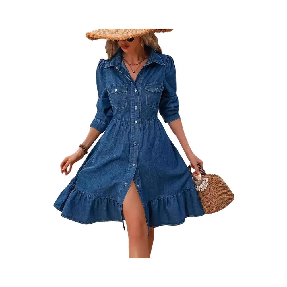 Women's Casual Vintage Medium Wash 2025 Vacation Flowy Midi Denim Dress Long Puff Sleeve Button A-Line Ruffle