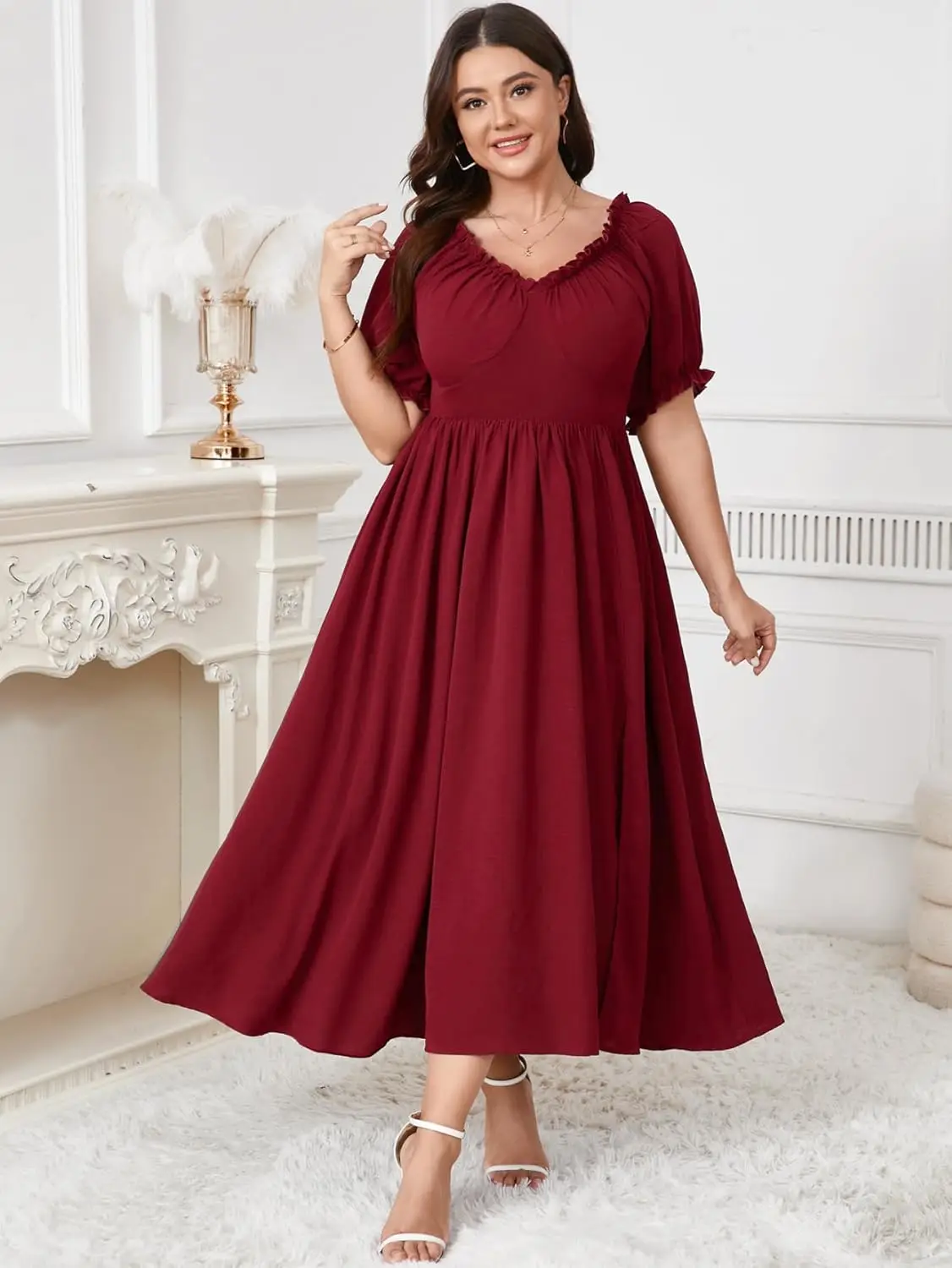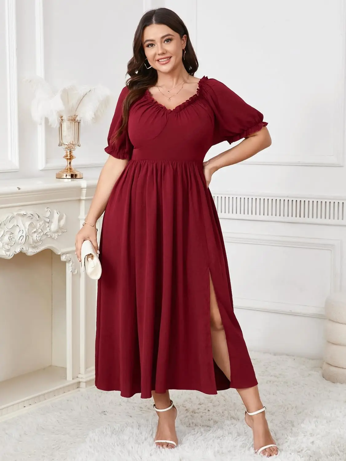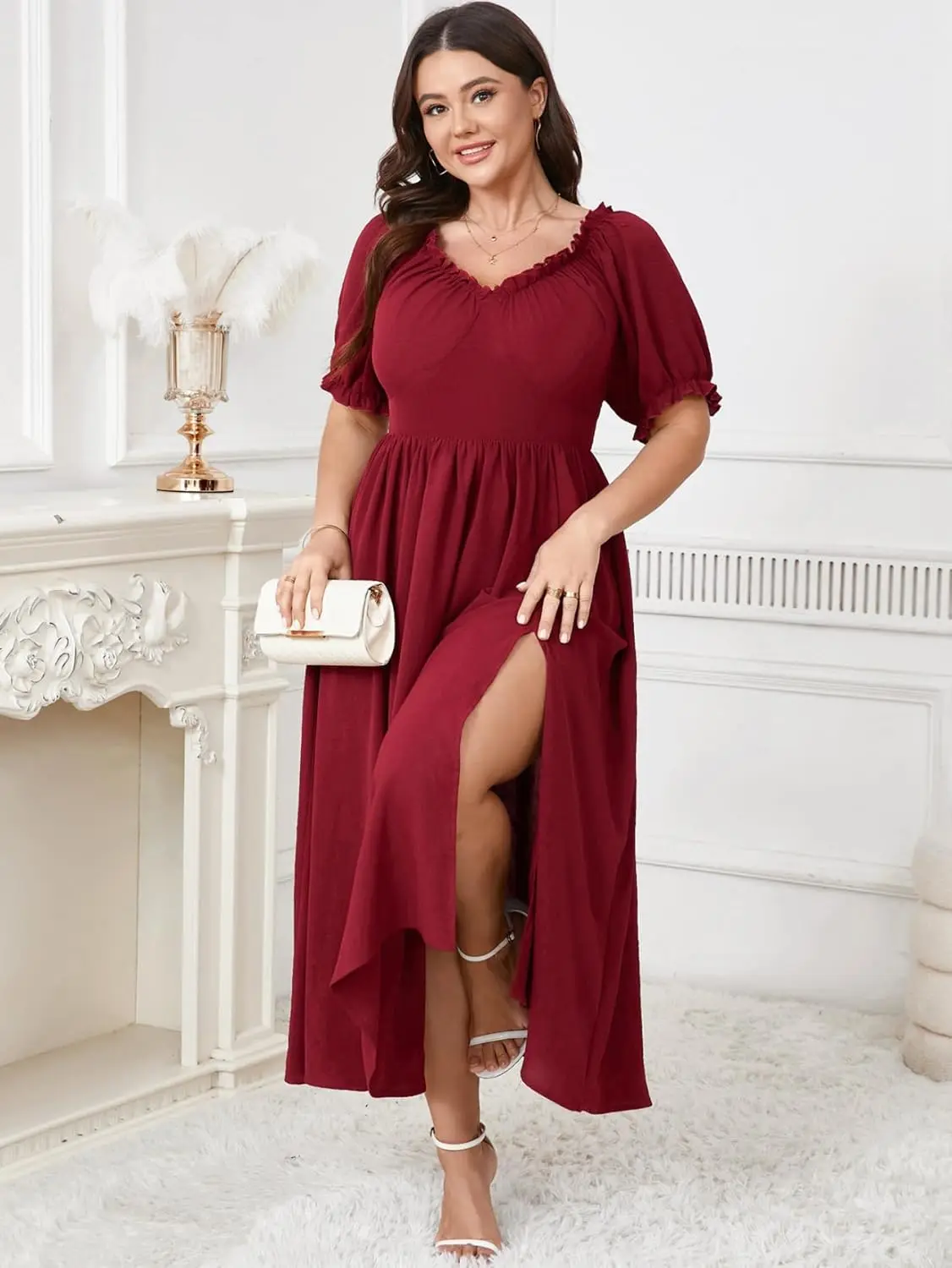 Women's Plus Size Summer Formal Maxi Dress V Neck Puff Short Sleeve Slit Anti-Static Chiffon Lace Ball Gown for Wedding Guests