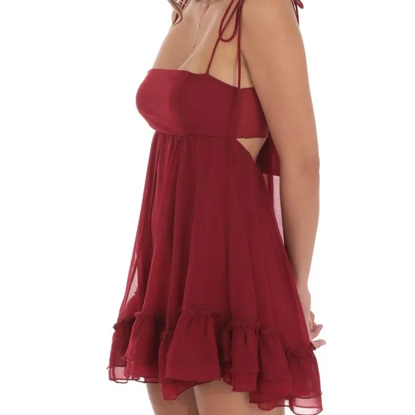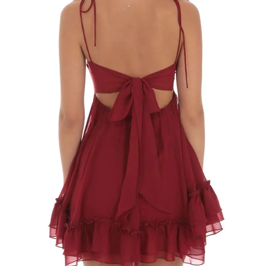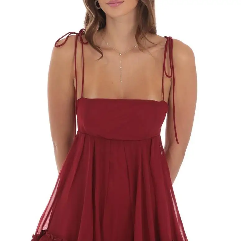 High Quality Summer New Red Chiffon Dress Strapless Waist Slimming Mini Suspender Skirt with Pleated Casual Style Solid Pattern