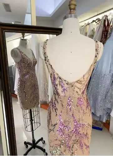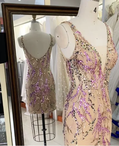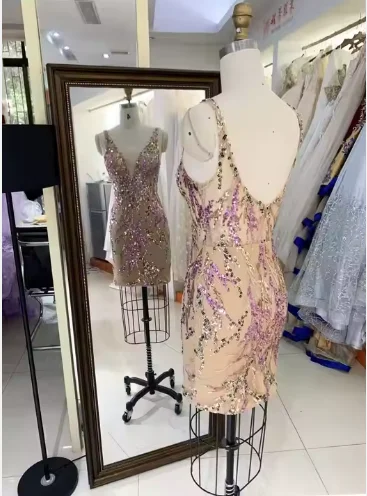 Custom-Made Multi-Color Glitter V-Neck Party Dress for Women Spaghetti Straps Natural Waistline Velvet Embroidery Sequined