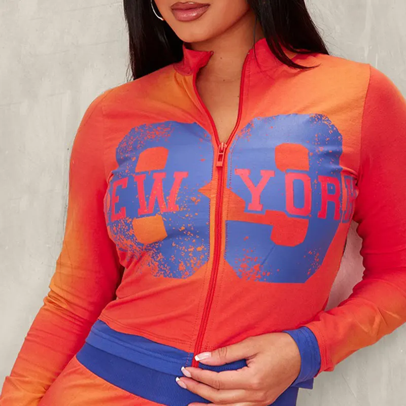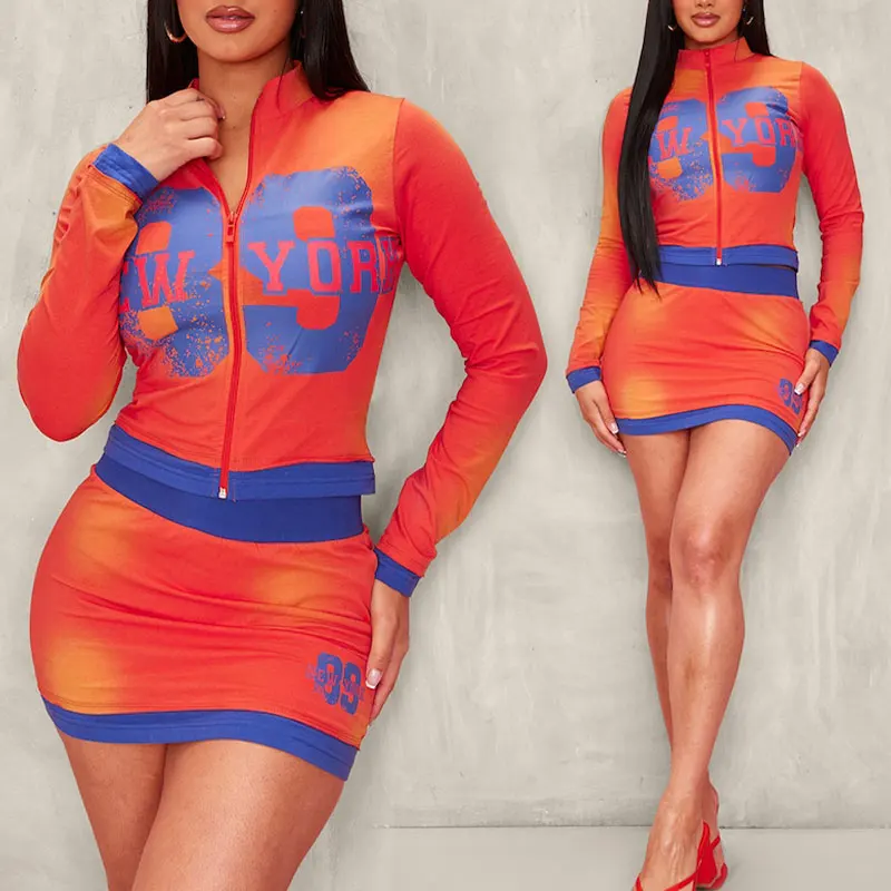 Manufacturer Long Sleeve Skinny Zip up Crop Top Loungewear 100% Cotton Custom logo Print Two Piece Skirt Set Women Clothing