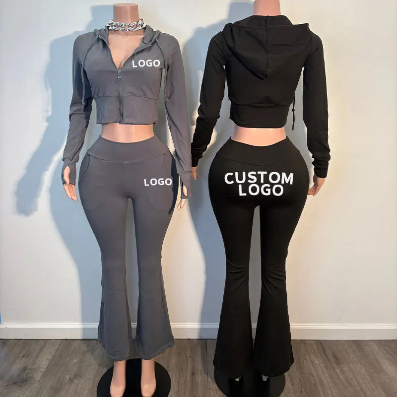 Huili New Arrival Slim Fit Stretch 2 Piece Flare Legging Pants Zip up Hooded Crop Top Outfits Women's Loungewear Activewear Sets