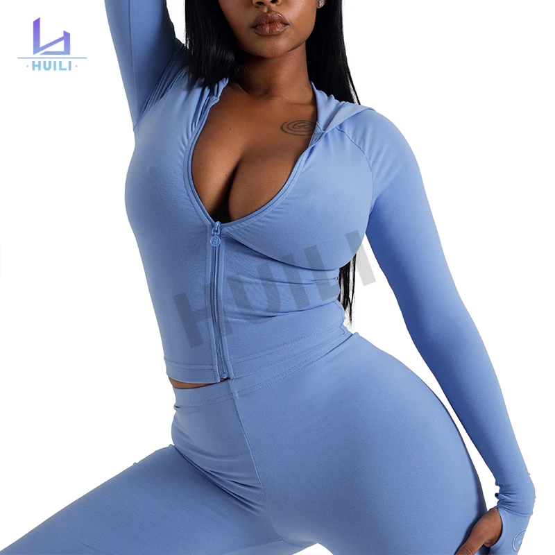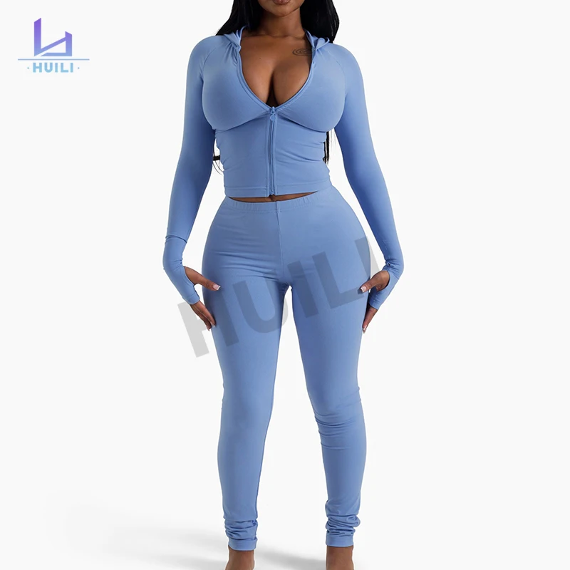 Huili Manufacturer Custom High Quality Two 2 Piece Fitness Gym Workout Tracksuits OEM Heavyweight Zip up Bodysuits for Women
