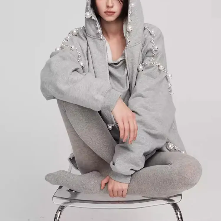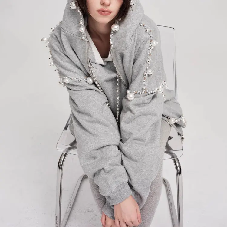 Huili Custom Logo 100% Cotton Zip up Jacket Women's Oversized French Terry Top Heavyweight Loose Y2K Pearl Embellished Hoodie