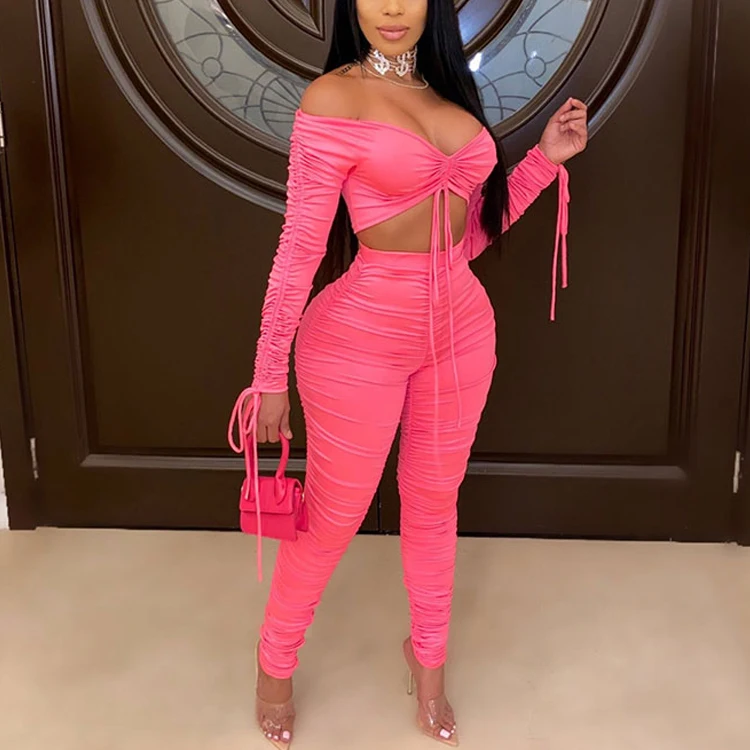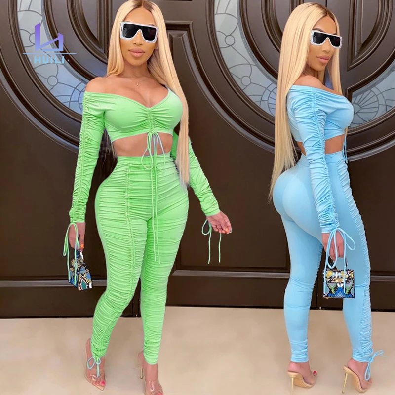 Huili Women's Stretch Crop Top Leggings Custom Logo Oem Skinny Drawstring Straps Tracksuits High Stretch 2 Outfits Ripped