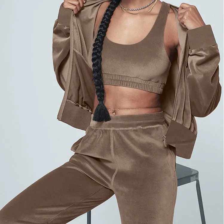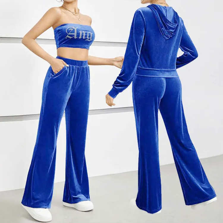 Huili Custom Logo High Quality Velour 3 Piece Set Zip up Cropped Hooded Top Pants Lounge Wear Y2K Women Velvet Hoodie Tracksuit