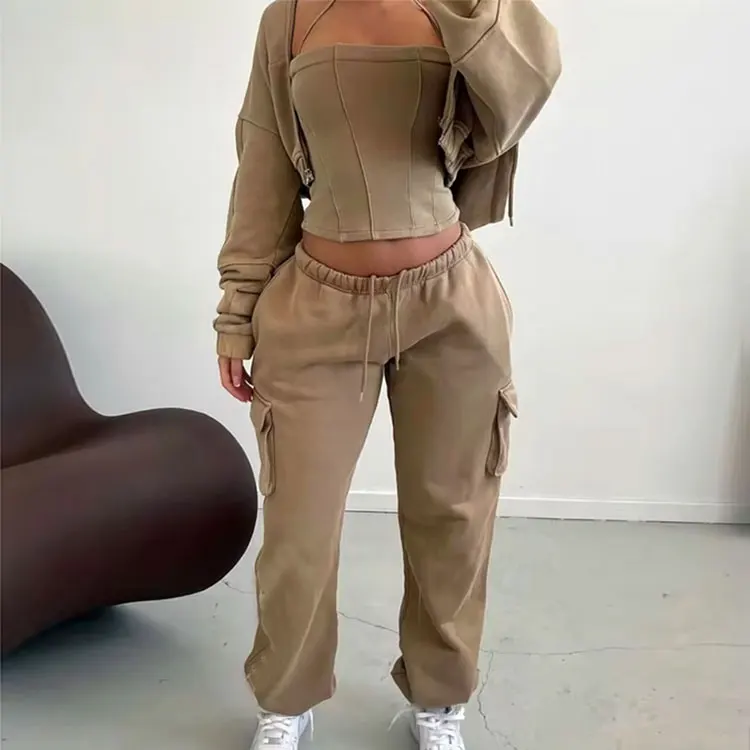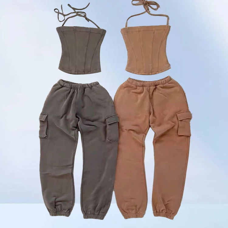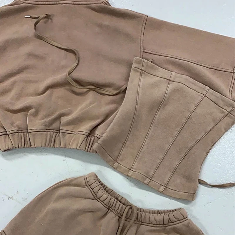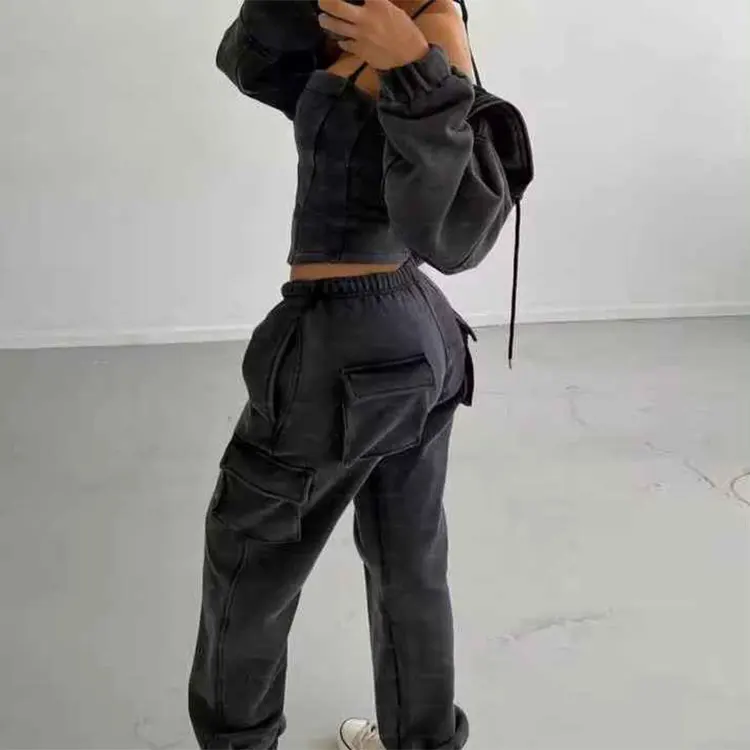 Huili Custom Acid Wash Heavyweight French Terry 3 Piece Matching Set Crop Top & Joggers OEM Tracksuits Winter Outfits for Women