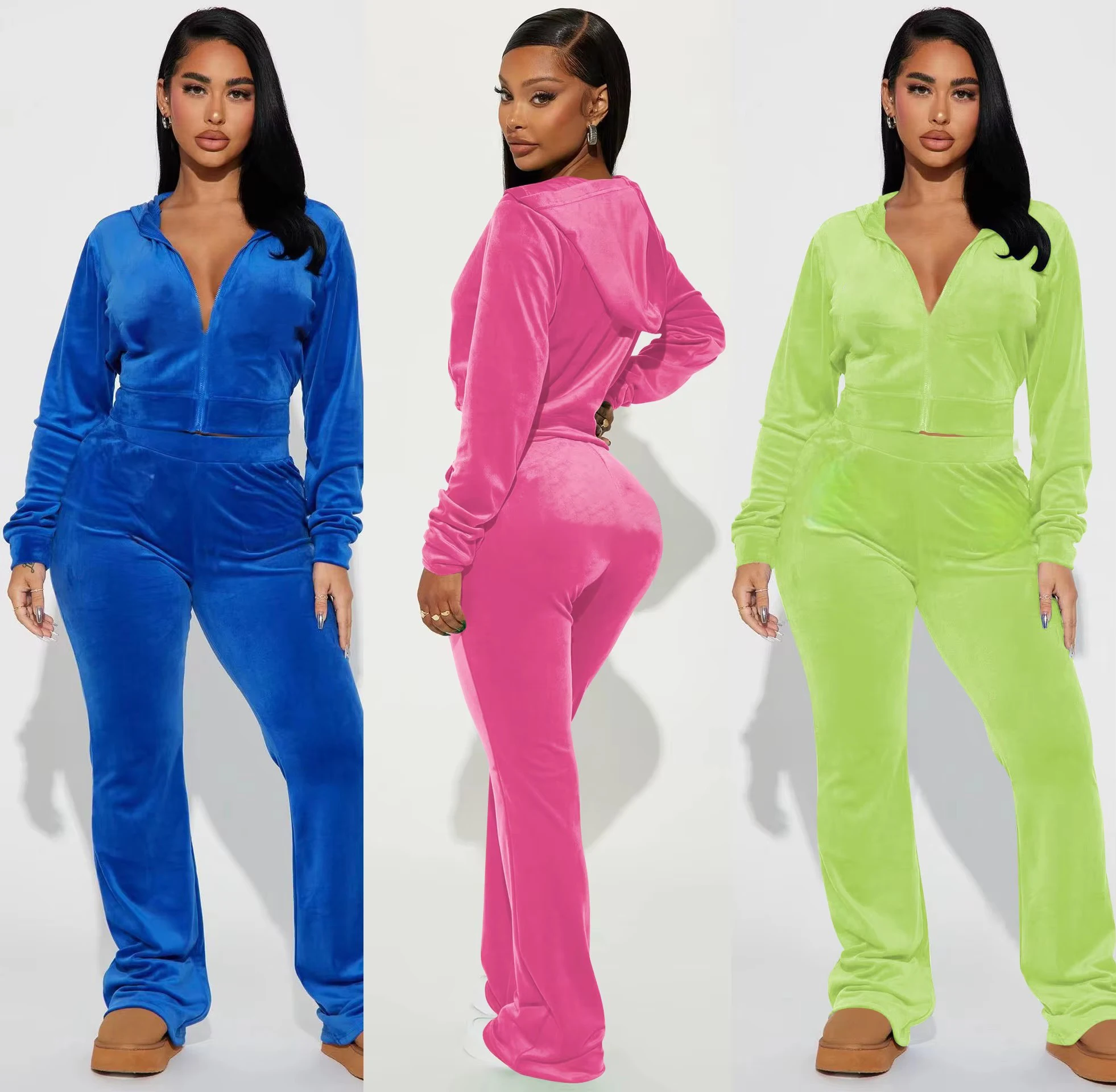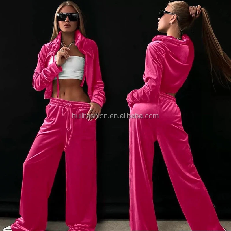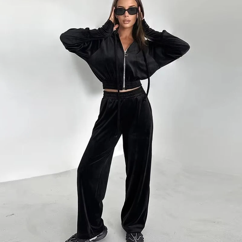 Customs Rhinestone Logo Crop Jacket Women Sets Y2K Velvet Flare Pants With Hoodie Women Loungewear Outfit Women 2 Piece Set
