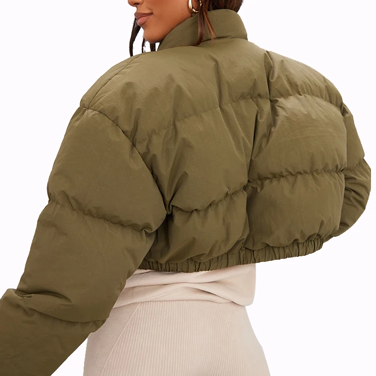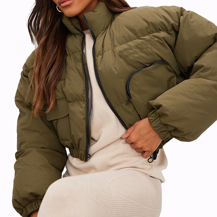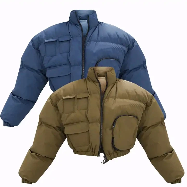 Custom Logo Embroidery Women Fashion High Neck Winter Warmth Outdoor Loose Bubble Down Cargo Cropped Puffer Jacket
